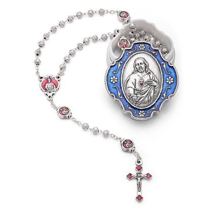 Blue Enameled Sacred Heart of Jesus Rosary Case With Rose-shaped Beads Rosary