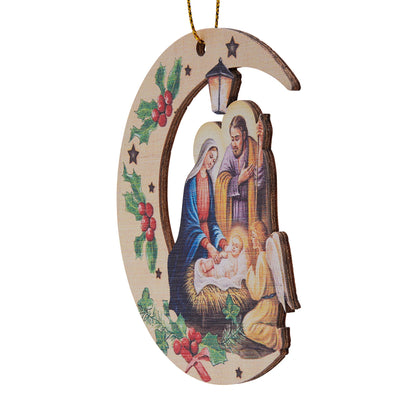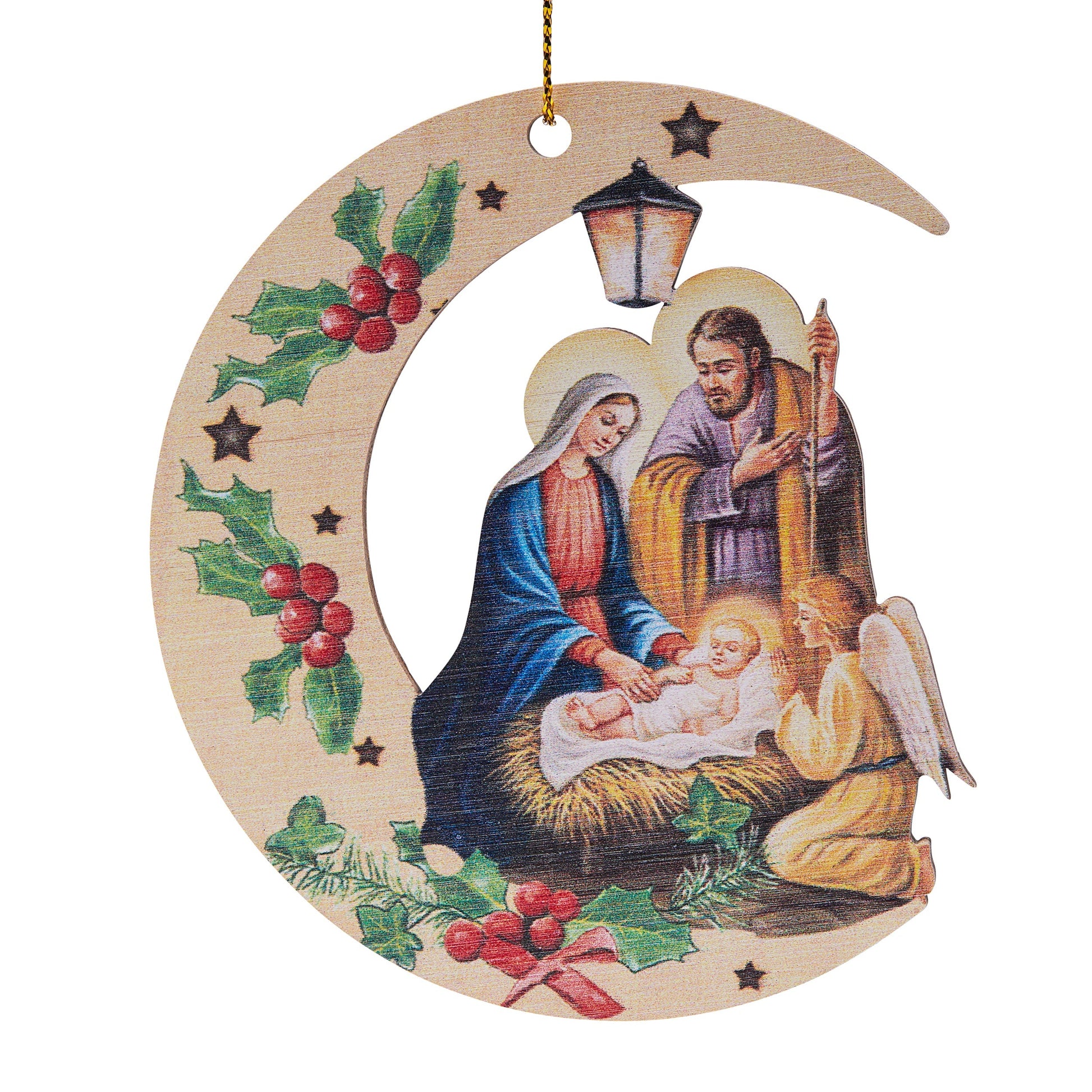 Carved Wooden Christmas Tree Decoration in the Shape of Moon With Nativity Scene