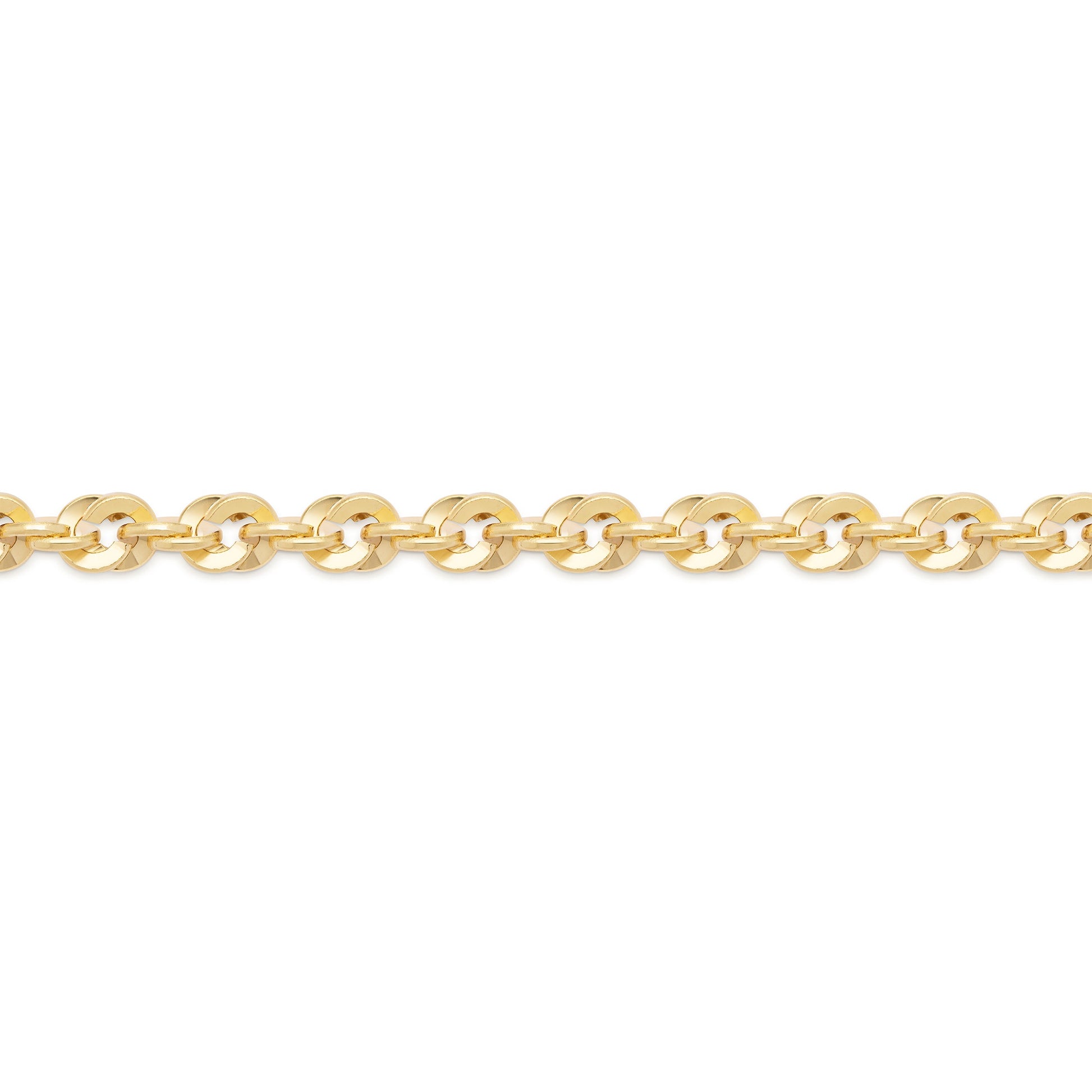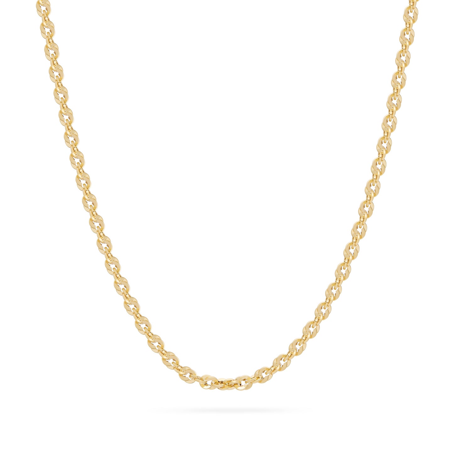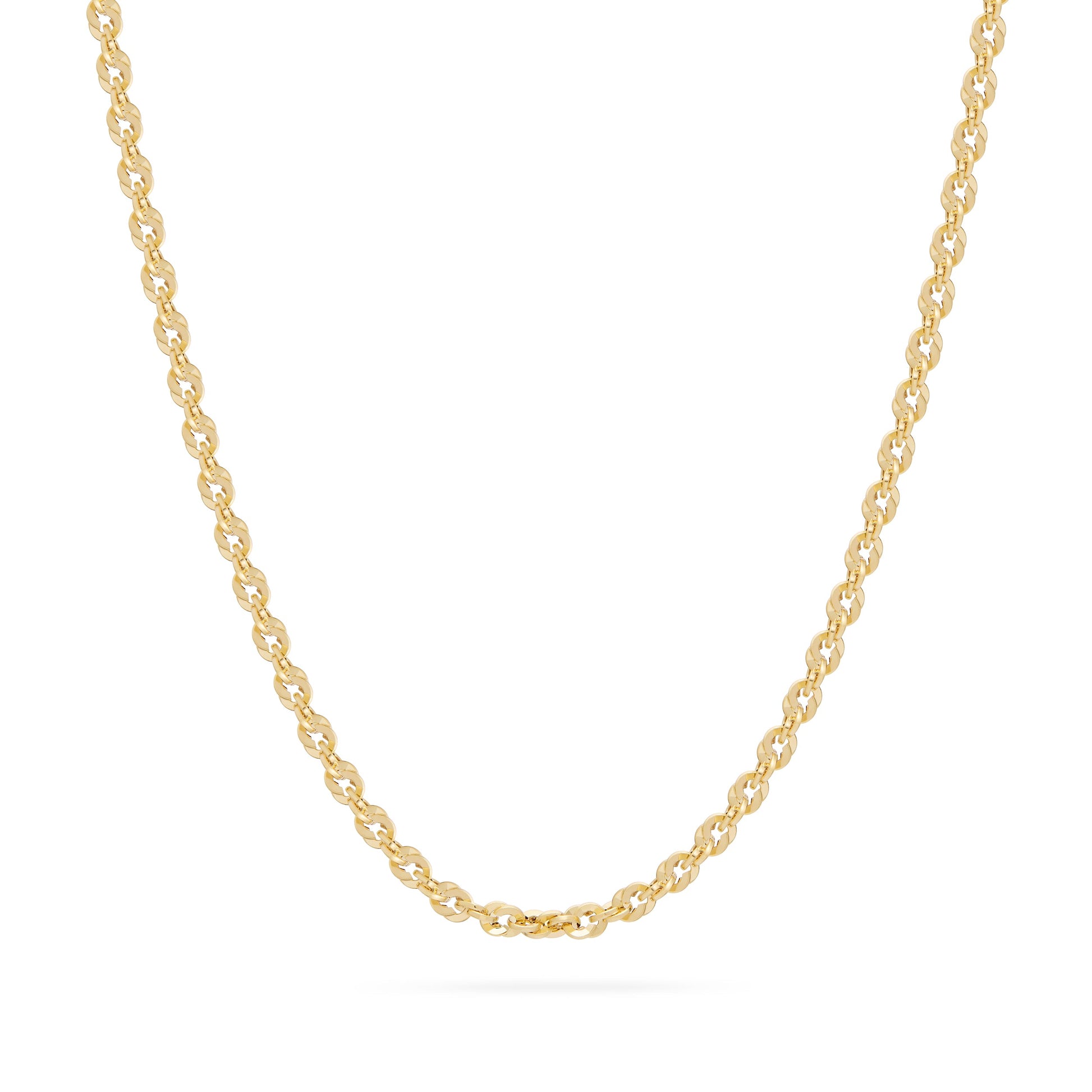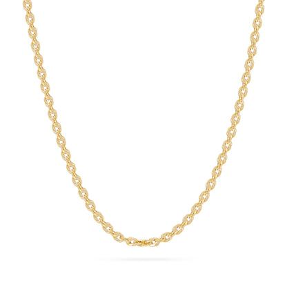 Bold and radiant, this chunky yellow gold Iride chain necklace features a distinctive double-link weave that gives it both volume and brilliance. The interlaced circular links reflect light from every angle, making it a highly visible and eye-catching piece. Perfect worn alone or as a strong base for meaningful pendants.