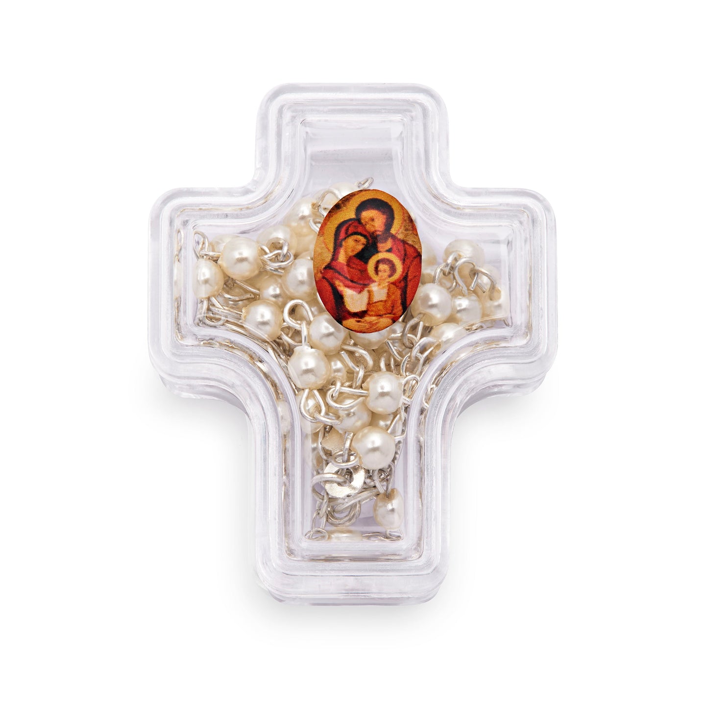 Cross-shaped Holy Family Rosary Case with White Synthetic Pearl Rosary