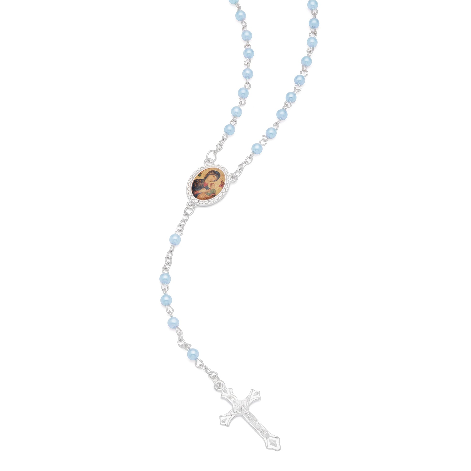 This elegant cross-shaped rosary case is dedicated to Our Lady of Perpetual Help, a symbol of protection and spiritual guidance. Inside, you'll find a rosary with light blue synthetic pearl beads, adding a touch of serenity and beauty to your daily prayers. Perfect as a gift or for personal use, this rosary will accompany you in moments of reflection and devotion.