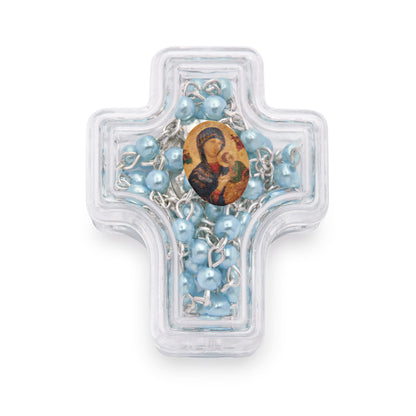 Cross-shaped Our Lady of Perpetual Help Rosary Case with Light Blue Synthetic Pearl Rosary