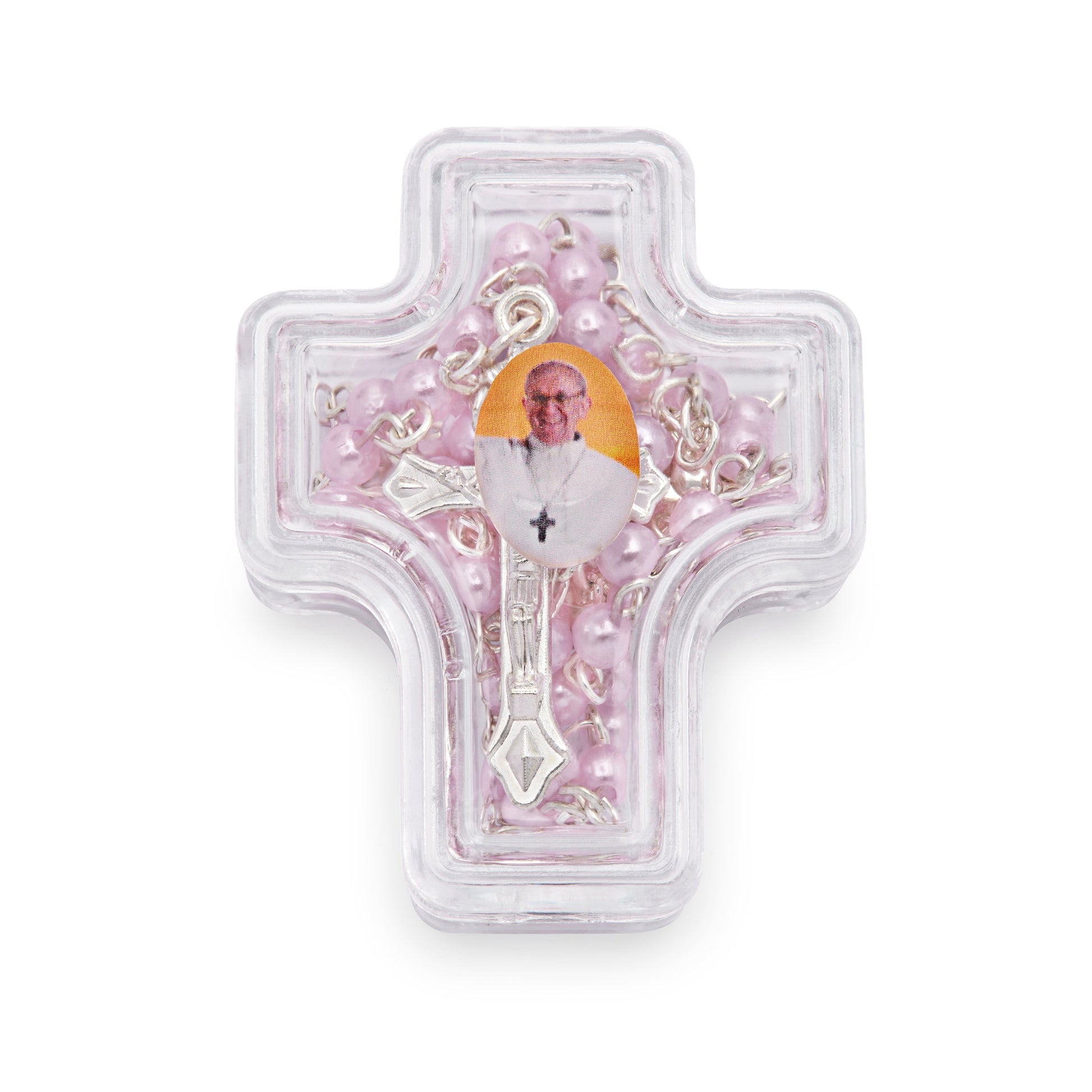 This practical cross-shaped rosary case, featuring an image of Pope Francis, comes with a beautiful light pink synthetic pearl rosary. The soft and delicate pink beads bring a sense of calm and elegance, making this rosary not only functional but also visually appealing. Its compact size makes it perfect for carrying with you wherever you go, ideal for daily devotion or as a thoughtful gift.