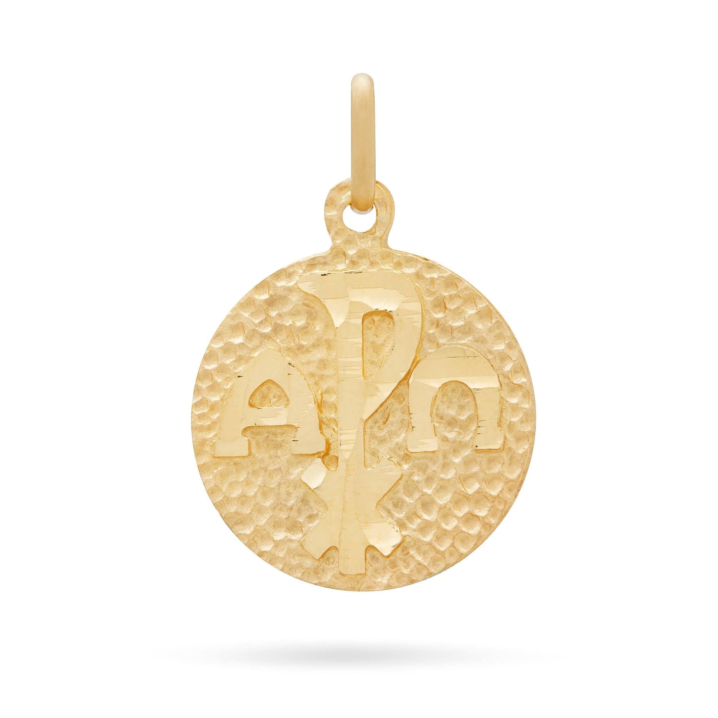 Double sided Chrismon medal in sterling silver plated in gold depicting on one side the monogram of Christ on the other side Mater Ecclesiae.