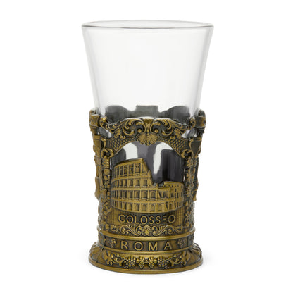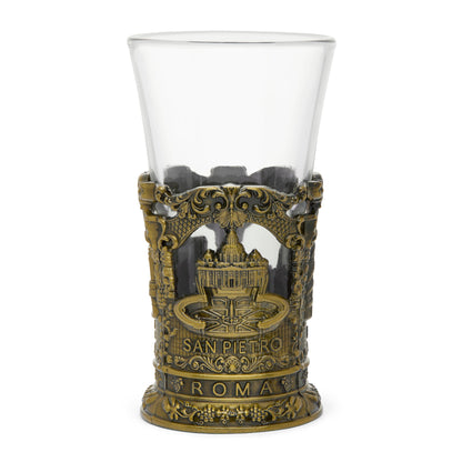 This exquisite shot glass is designed with a clear glass top and a gold-toned metal base. The golden base features intricate patterns and beautifully highlights detailed representations of St. Peter's Basilica and the Colosseum. A sophisticated souvenir or gift that celebrates the timeless beauty of Rome.