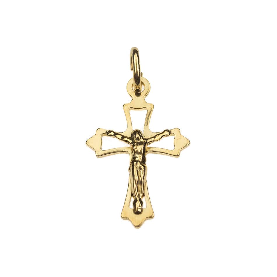 Sterling silver Budded openwork crucifix plated in 18kt gold.