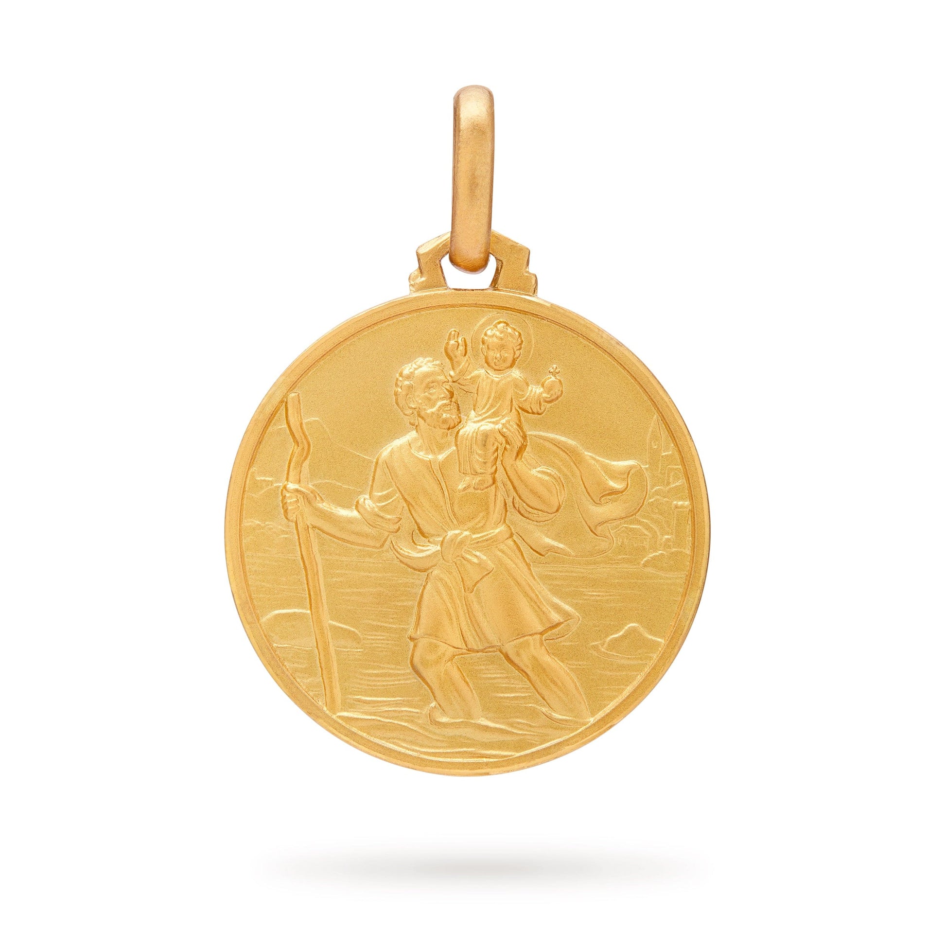 The gold-plated sterling silver medal of Saint Christopher is a profoundly significant emblem of protection for those involved in transportation activities. Saint Christopher is recognized as the patron saint of a wide range of professions and individuals related to transport, including boatmen, pilgrims, commuters, wayfarers, travelers, porters, railway workers, and drivers. This medal represents not only a symbol of faith but also a talisman for those who face journeys and travel, offering them protection and safety. Finely crafted, with details depicting Saint Christopher carrying the Child Jesus, this medal is a valuable gift for those seeking the saint’s blessing in their workdays or travels.