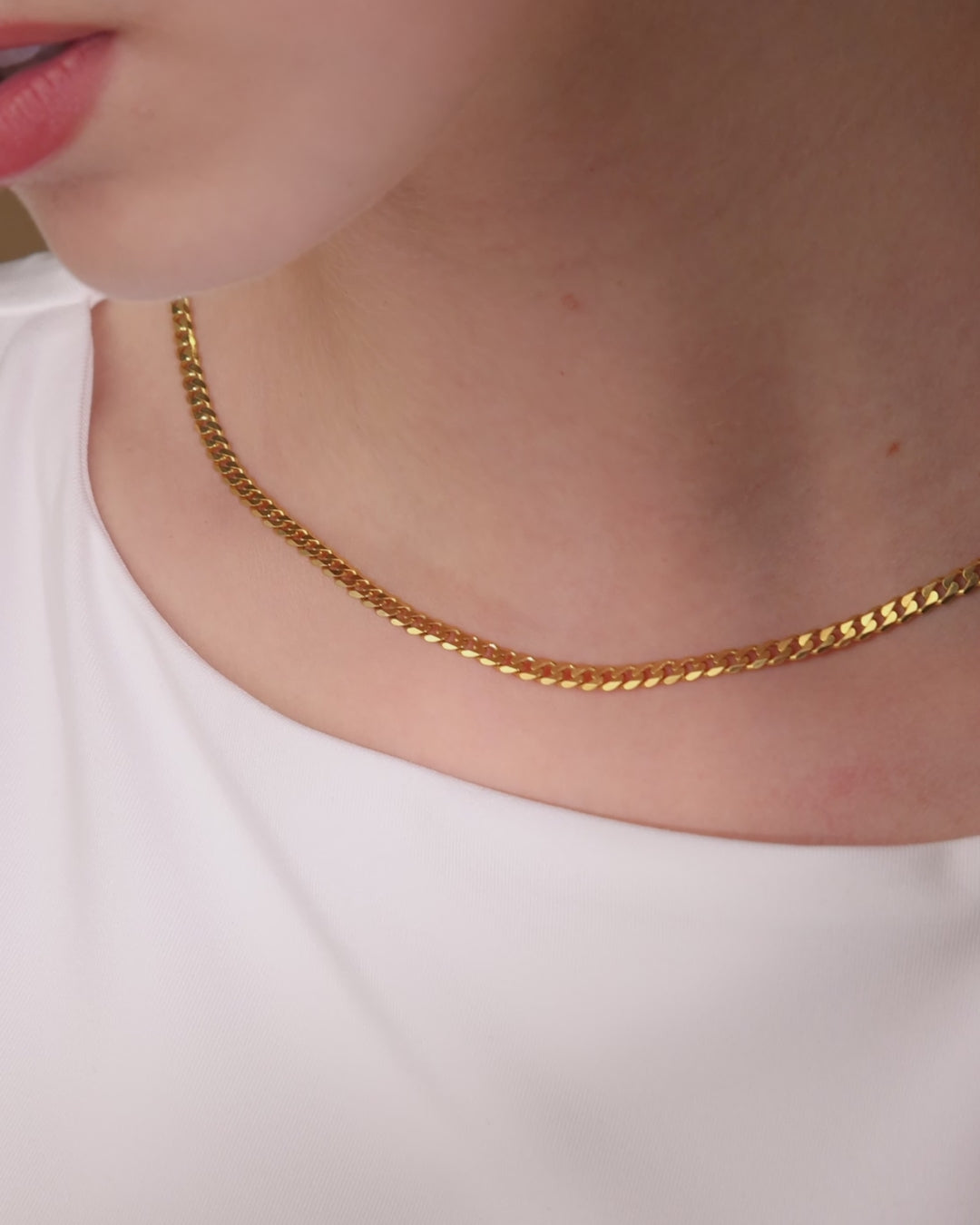 Bold and luminous, this thick curb chain necklace is crafted in 925 Sterling Silver and finished with a refined gold plating. The solid, closely linked structure gives the chain a strong presence while remaining comfortable for everyday wear. Perfect worn on its own or paired with a medal or cross, it offers a confident way to keep faith, protection, and personal devotion close to the heart.