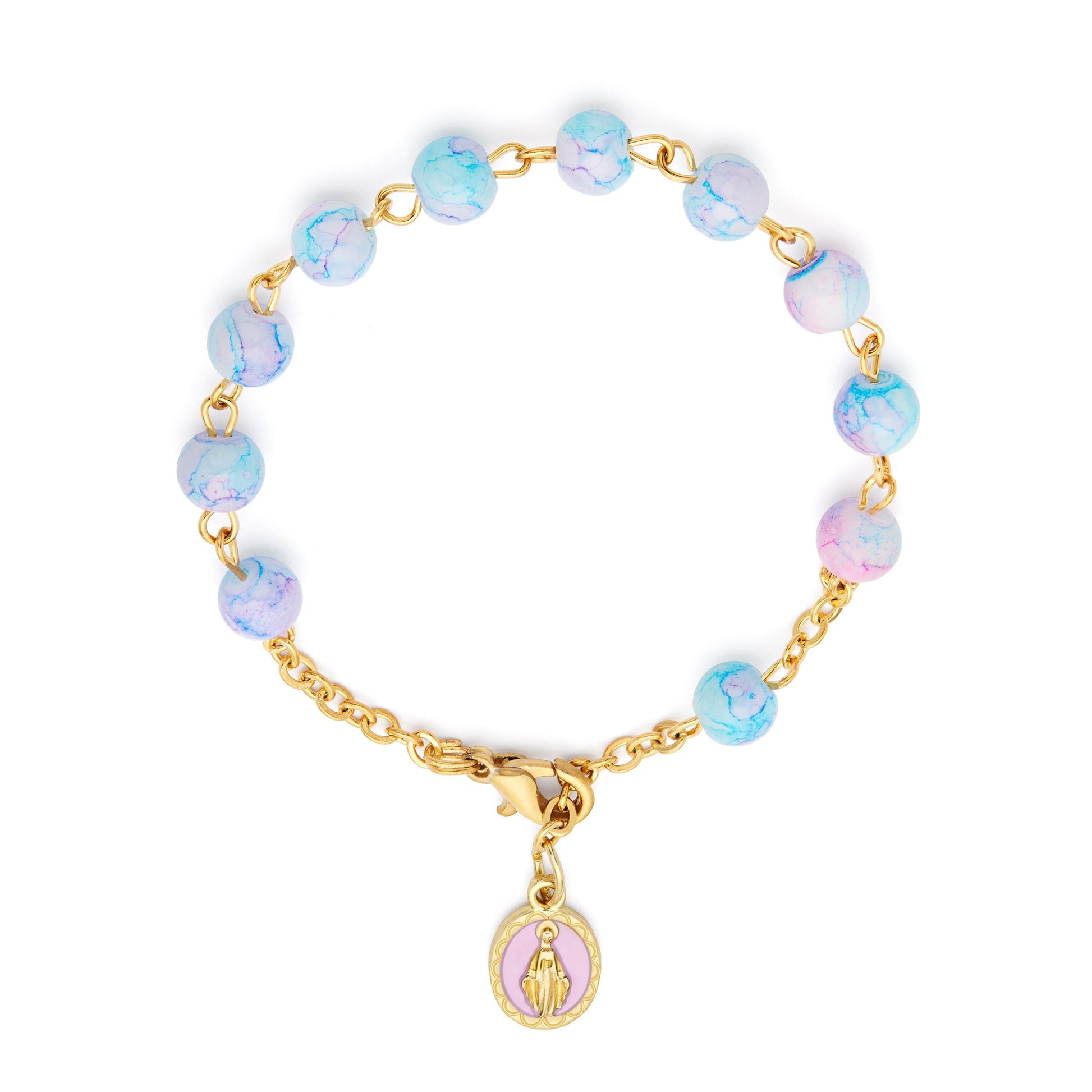 This graceful rosary bracelet blends soft pink and light blue variegated beads, evoking peace and devotion. The gentle tones harmonize beautifully with the gold-tone finish, creating a delicate and timeless piece. At the end of the bracelet, a rose-enamelled Miraculous Medal adds a unique and sacred touch. Designed for both prayer and daily wear, it is a meaningful accessory that serves as a reminder of faith, making it a cherished gift for any occasion.