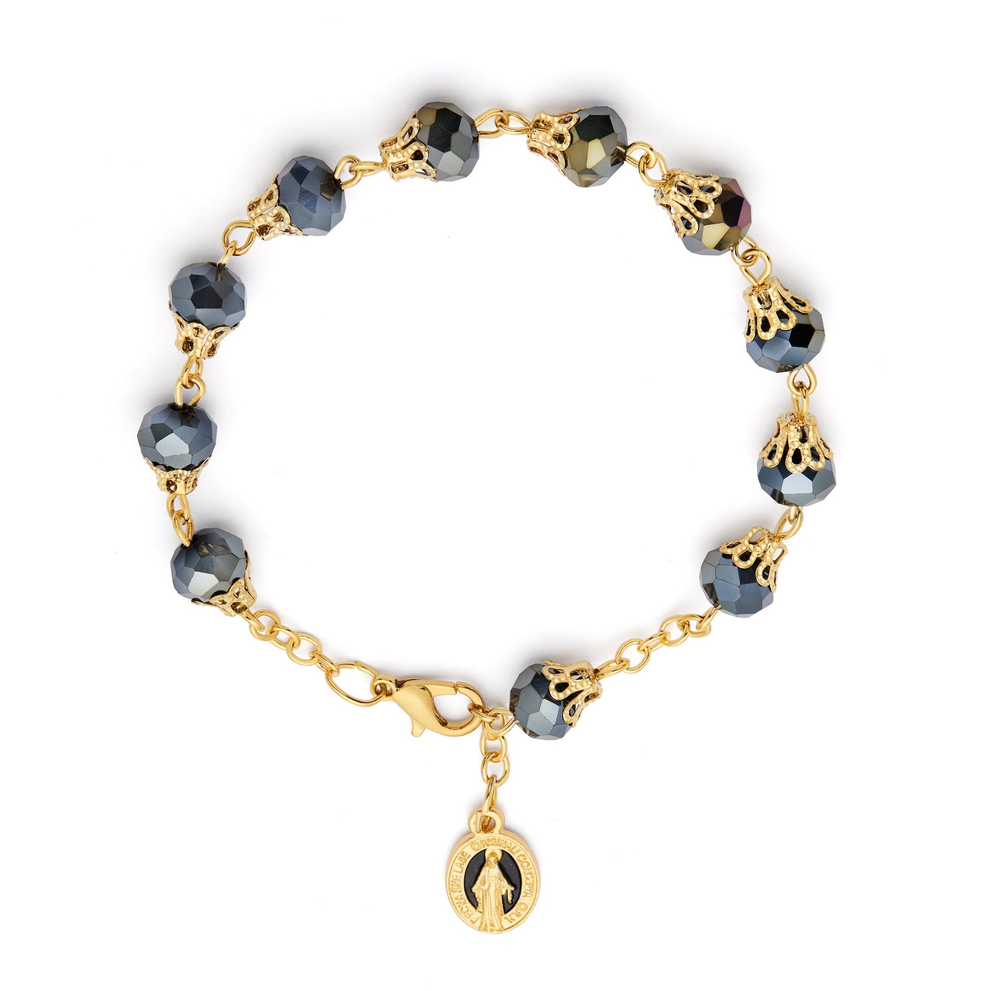 This elegant rosary bracelet features a single decade, crafted with a gold-tone finish and deep black crystal beads that add a touch of mystery and devotion. The beads, combined with decorative balloon-shaped bead caps, create a unique and refined silhouette. A beautifully enameled Miraculous Medal in matching black completes this sophisticated piece of faith and style.