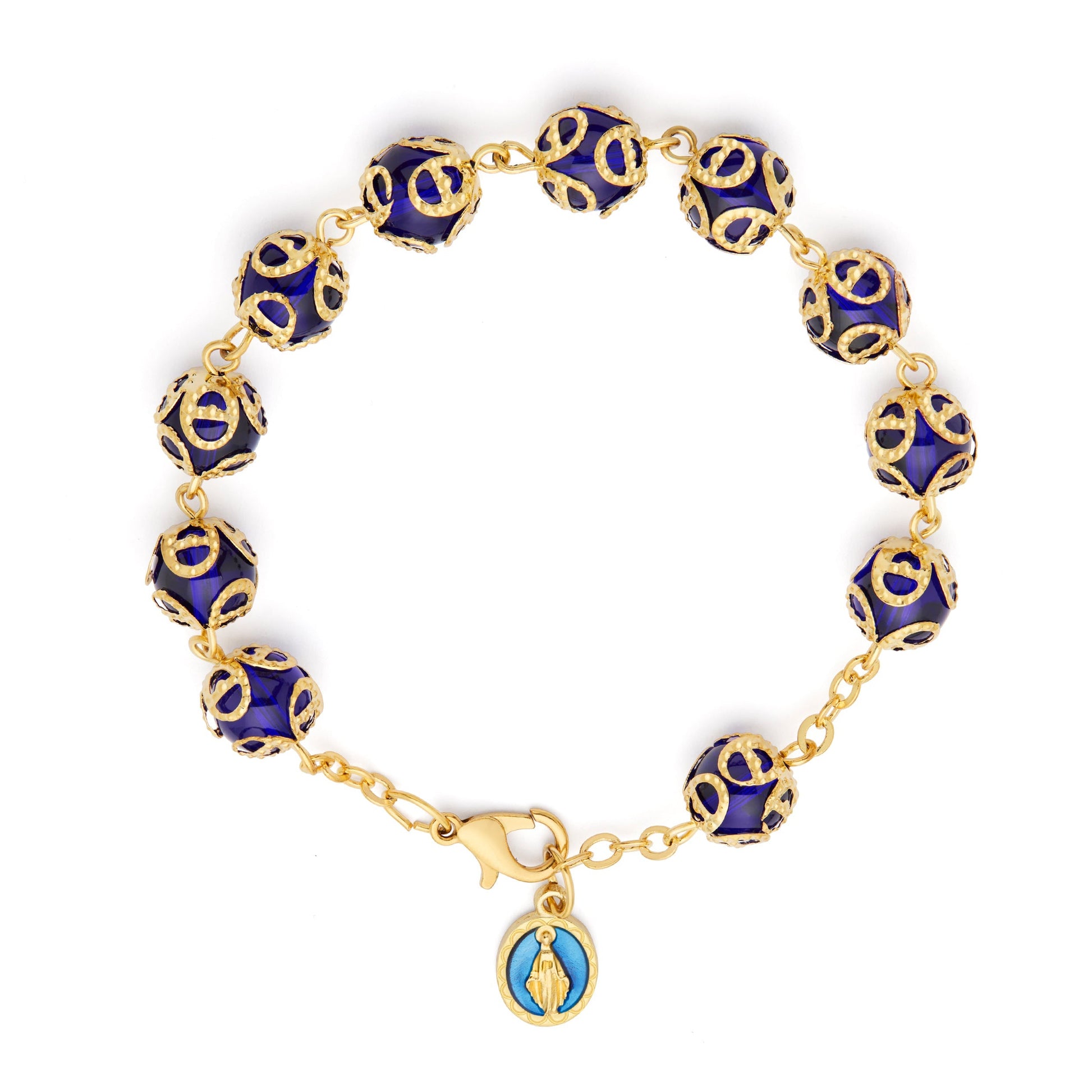 This elegant rosary bracelet features deep blue crystal beads, a color symbolizing peace, devotion, and the Virgin Mary. Simple yet refined bead caps add a delicate decorative touch, while the gold-tone finish beautifully contrasts with the blue hues. A Miraculous Medal enamelled in the same shade completes the design, reinforcing its meaning of faith and protection. A timeless piece to accompany moments of prayer and reflection.