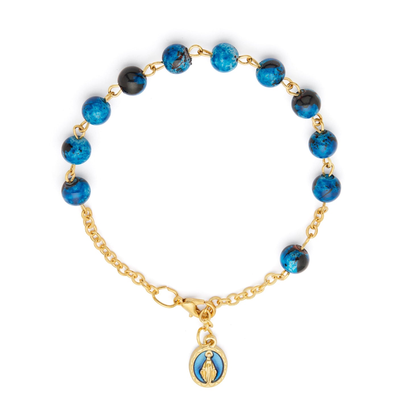 This elegant rosary bracelet features blue variegated beads, evoking serenity and devotion, combined with a gold-tone finish for a timeless spiritual accessory. A meaningful piece to carry faith with you every day, it is designed for both prayer and daily wear, making it a thoughtful and special gift.