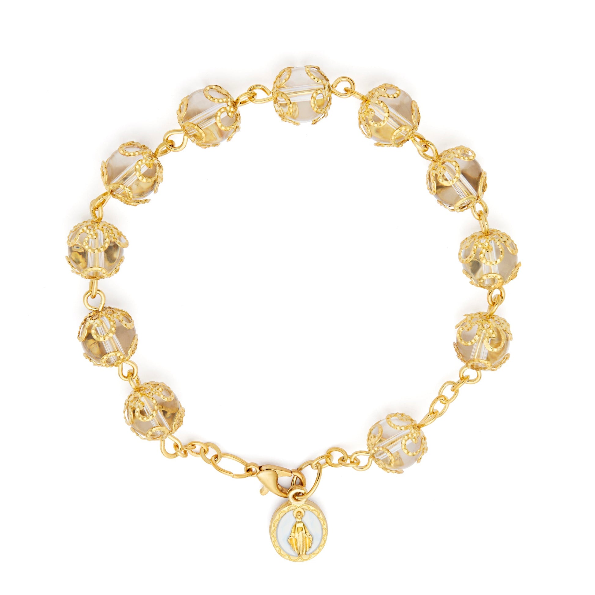 This elegant rosary bracelet features sparkling clear crystal beads adorned with intricate filigree bead caps, enhancing its refined and timeless style. The gold-tone finish adds a touch of sophistication, while the white-enamelled Miraculous Medal complements the brilliance of the crystals with a meaningful and harmonious detail. Perfect for prayer and everyday wear, it makes a thoughtful gift for any special occasion.