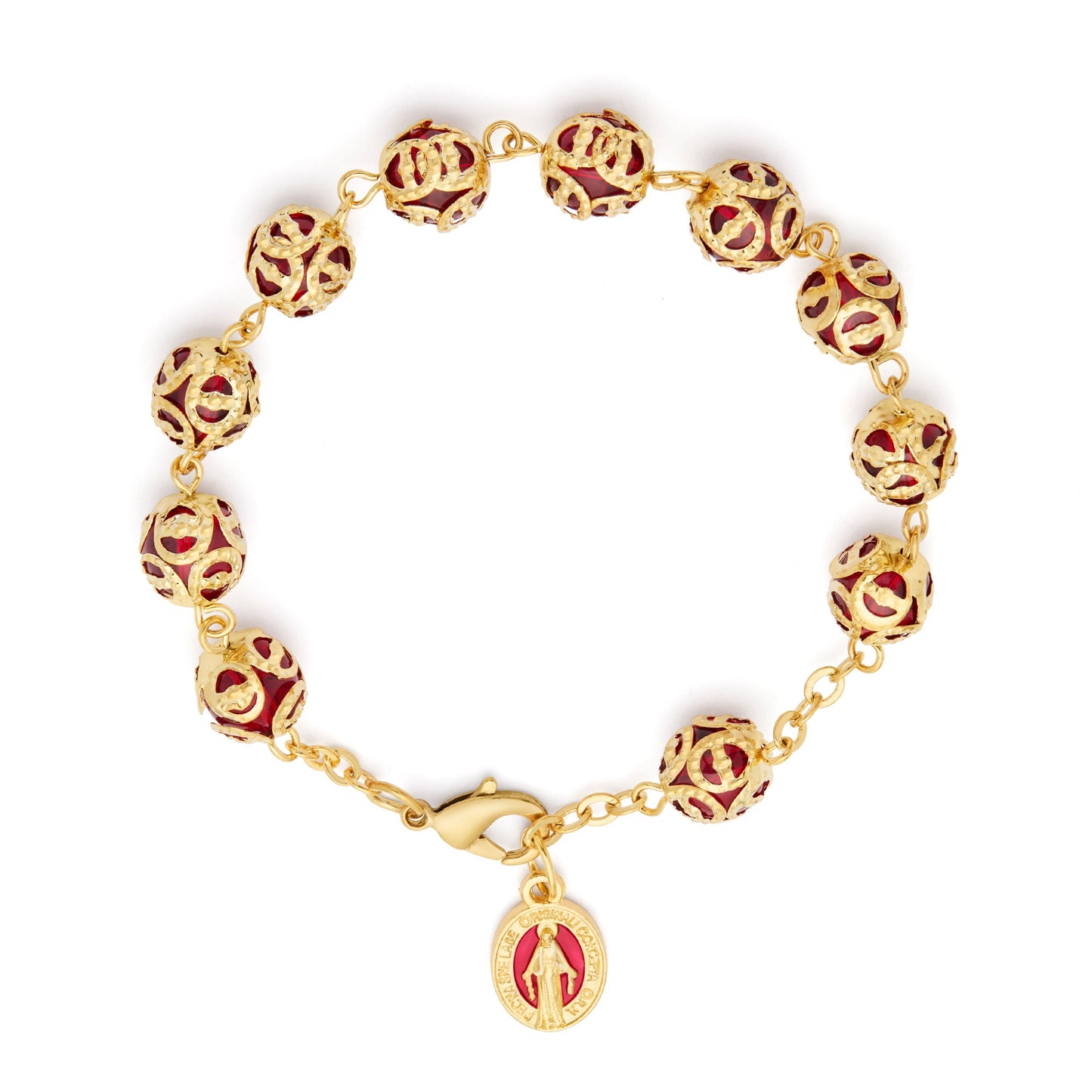 This elegant rosary bracelet features deep red crystal beads, a color symbolizing faith, sacrifice, and the love of Christ. The delicate bead caps add a refined decorative touch, while the gold-tone finish enhances its timeless beauty. A Miraculous Medal enamelled in the same shade of red completes the design, making it a meaningful companion for prayer and reflection.