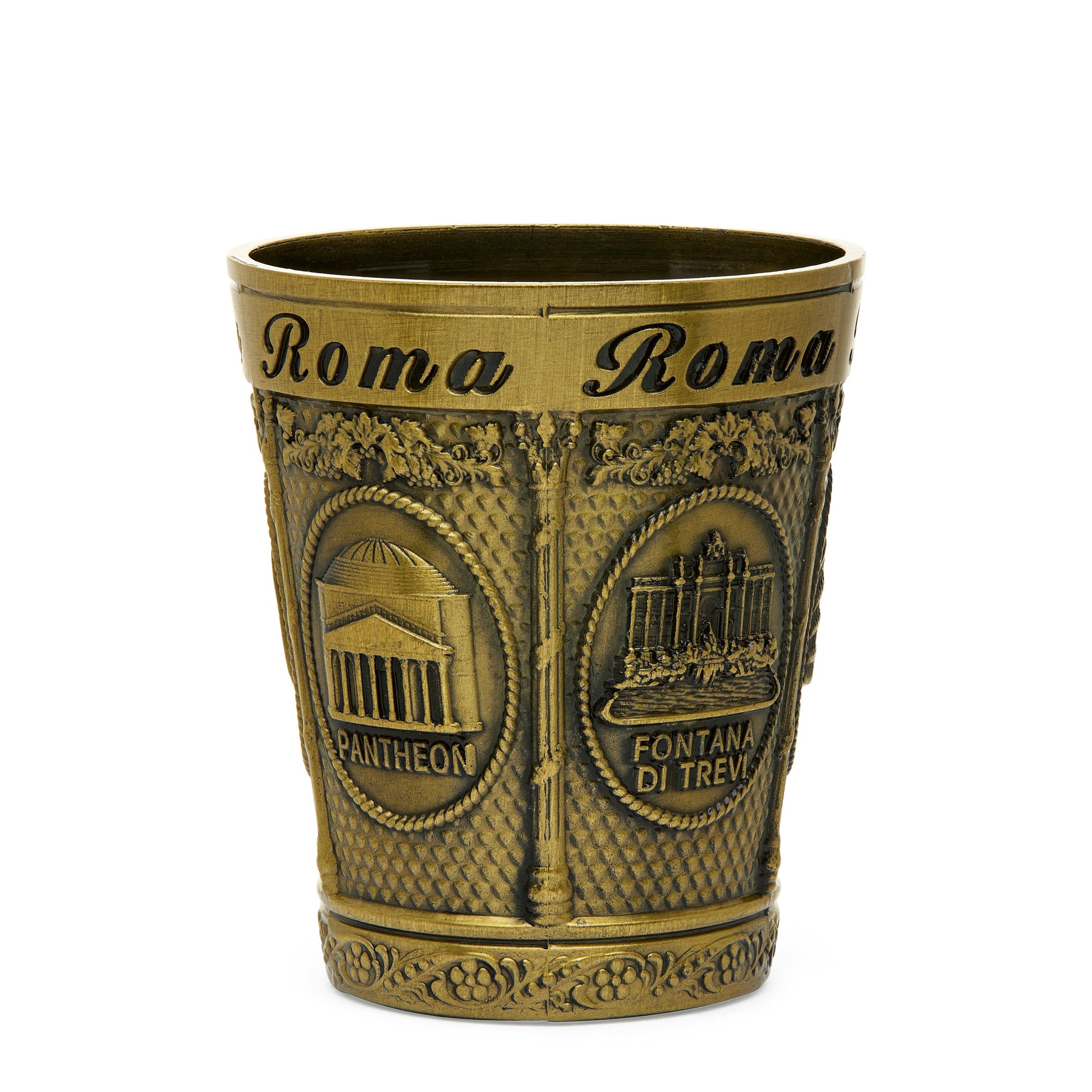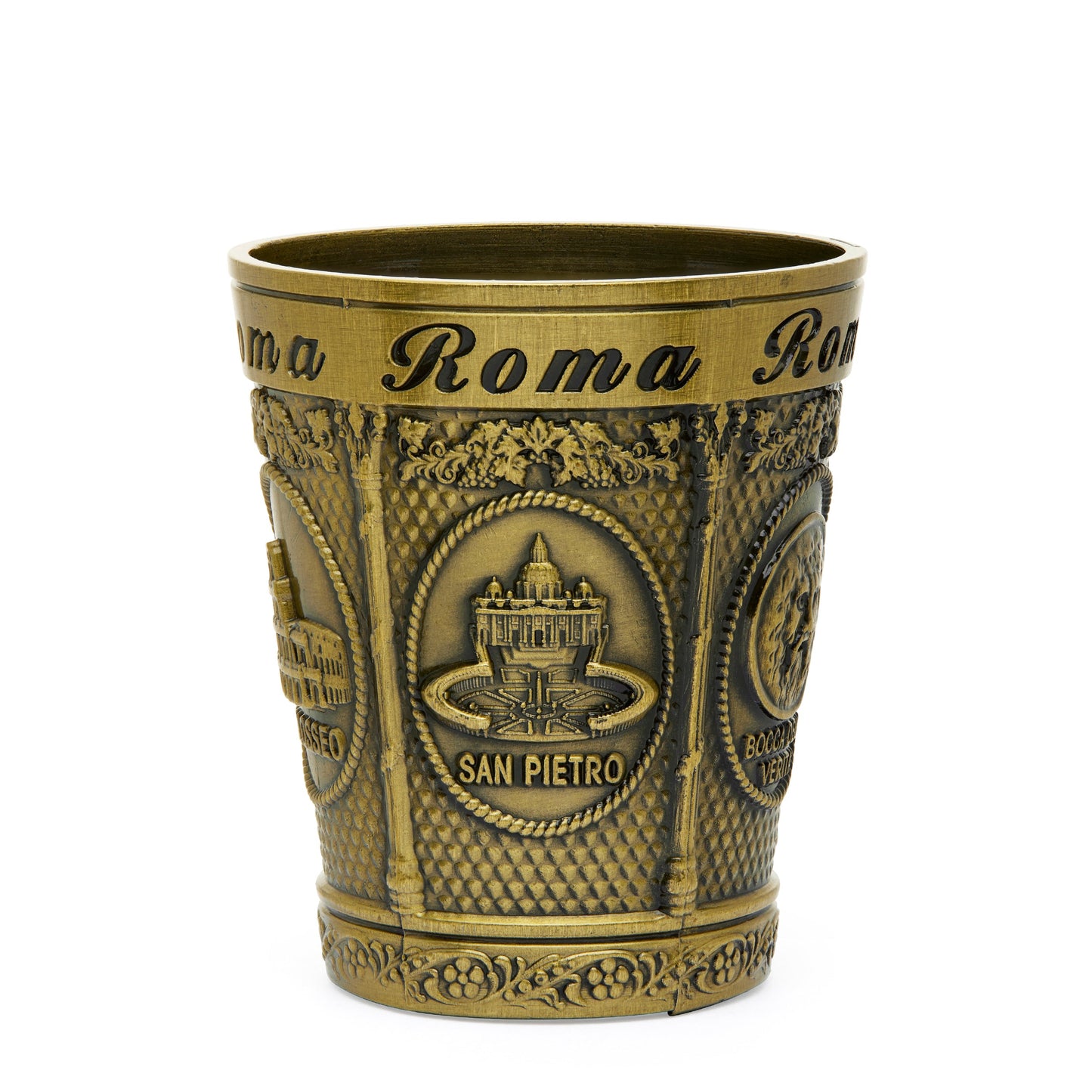This gold-toned metal shot glass captures the charm of Rome with its intricate depictions of St. Peter's Basilica and the Colosseum. A stunning souvenir that combines timeless elegance with the beauty of two of the world’s most famous landmarks, perfect for any collector or as a memorable gift.