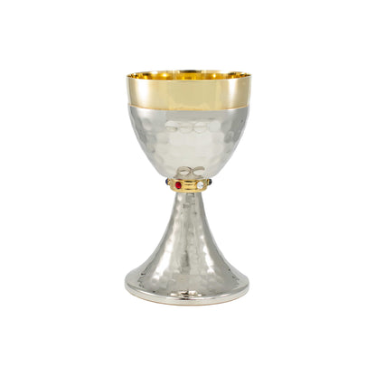 Bicolor Chalice made of Golden and Silvered Brass with hammered base saucer. Knot with stones set. Cup diameter 10 cm.