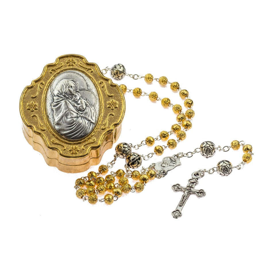 Golden Rosary Case With Madonnina of Ferruzzi and Rose-shaped Beads Rosary