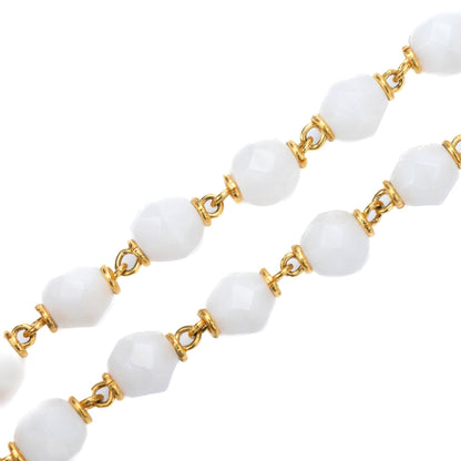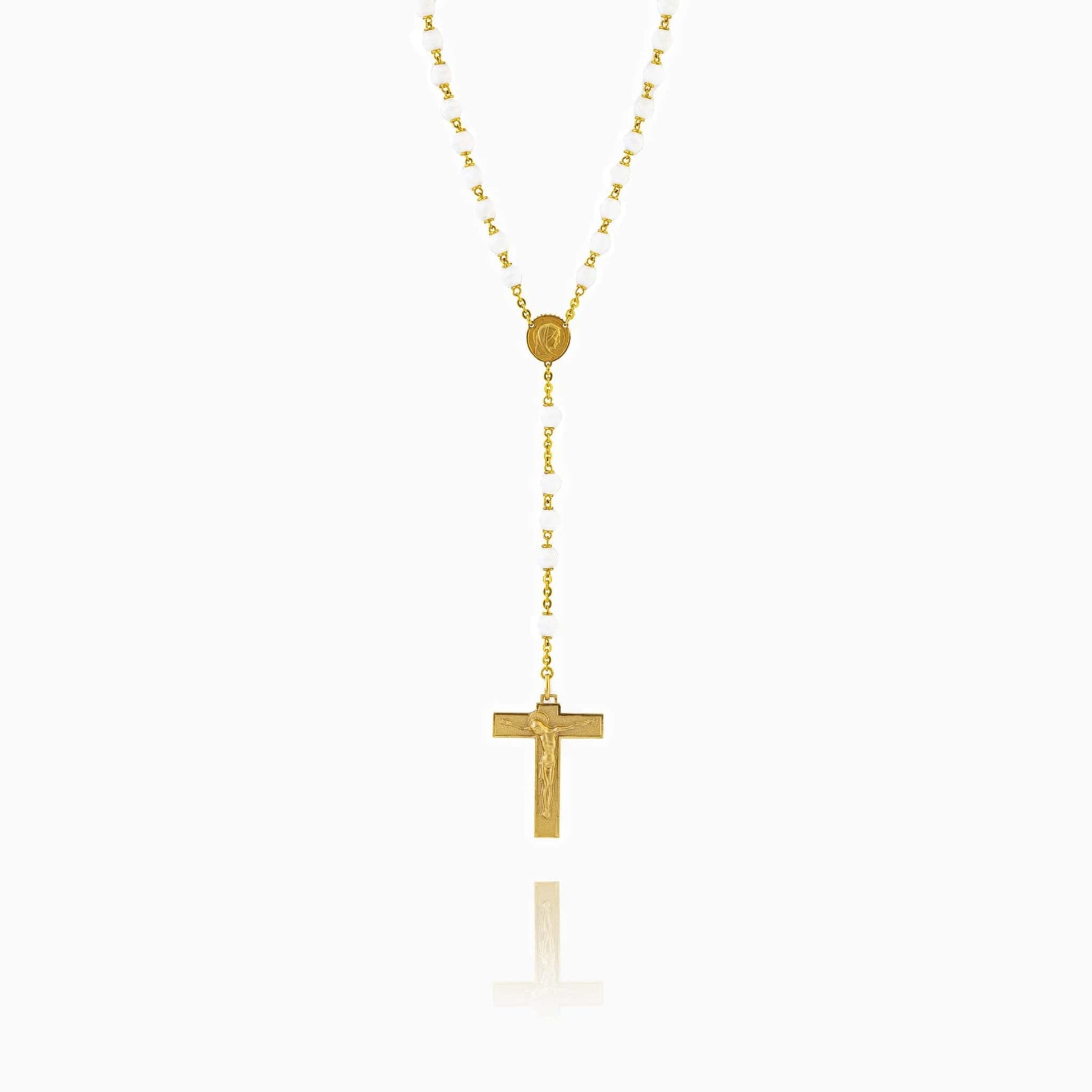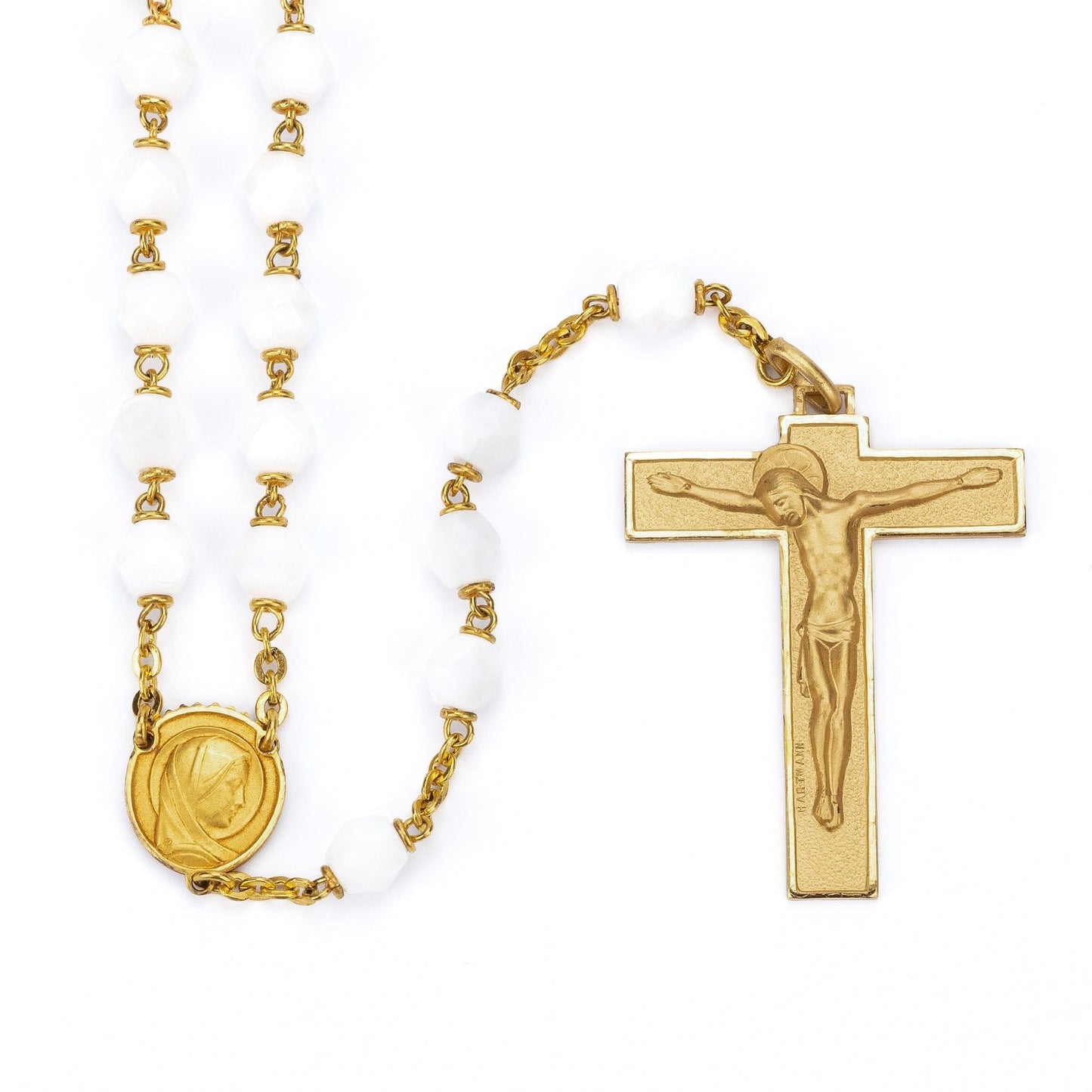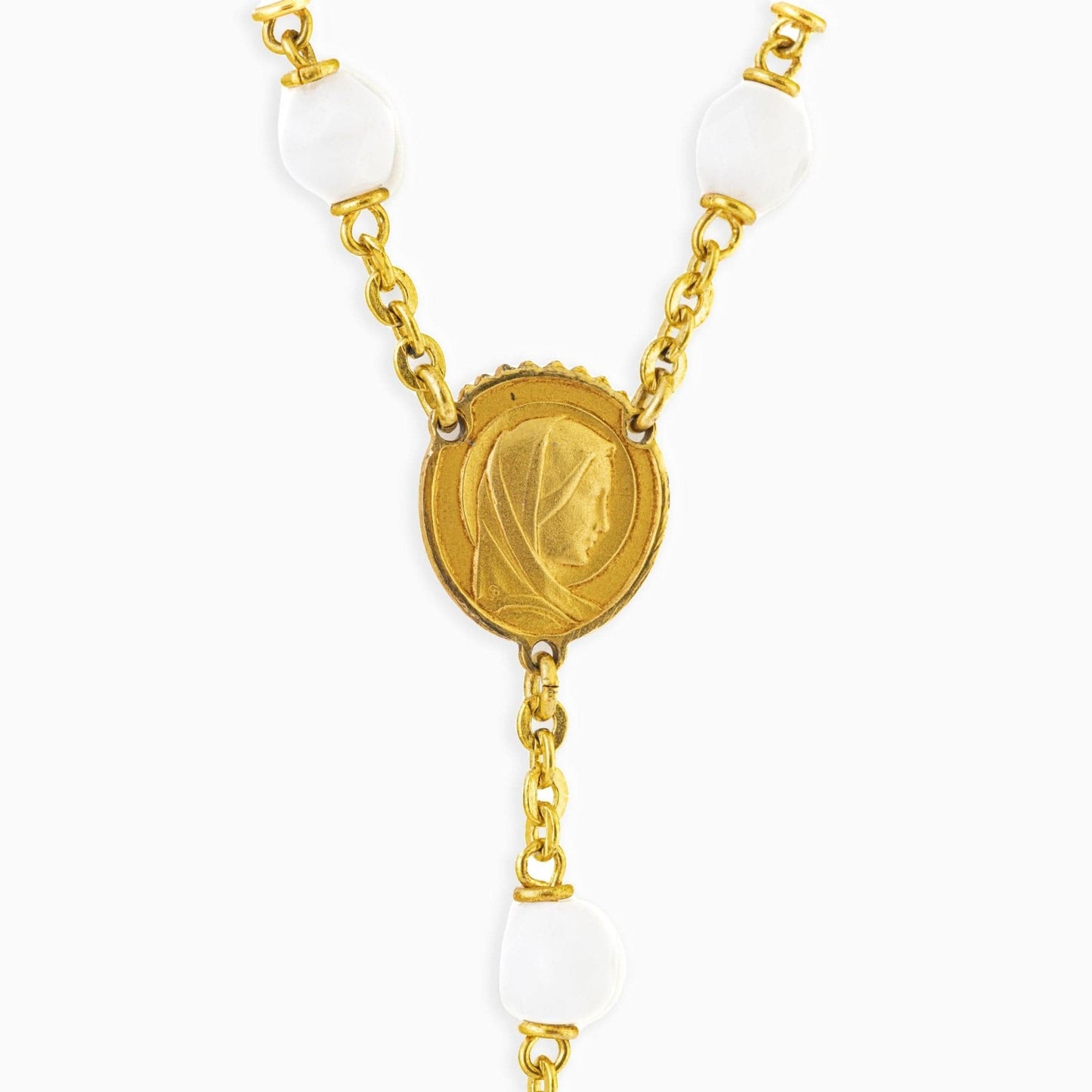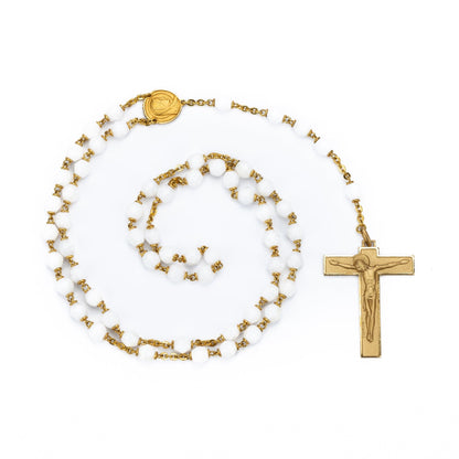 Special gold plated Rosary, sometimes known in English by the French term vermeil. White glass paste beads, Mother Mary medal and beautiful flat cross.