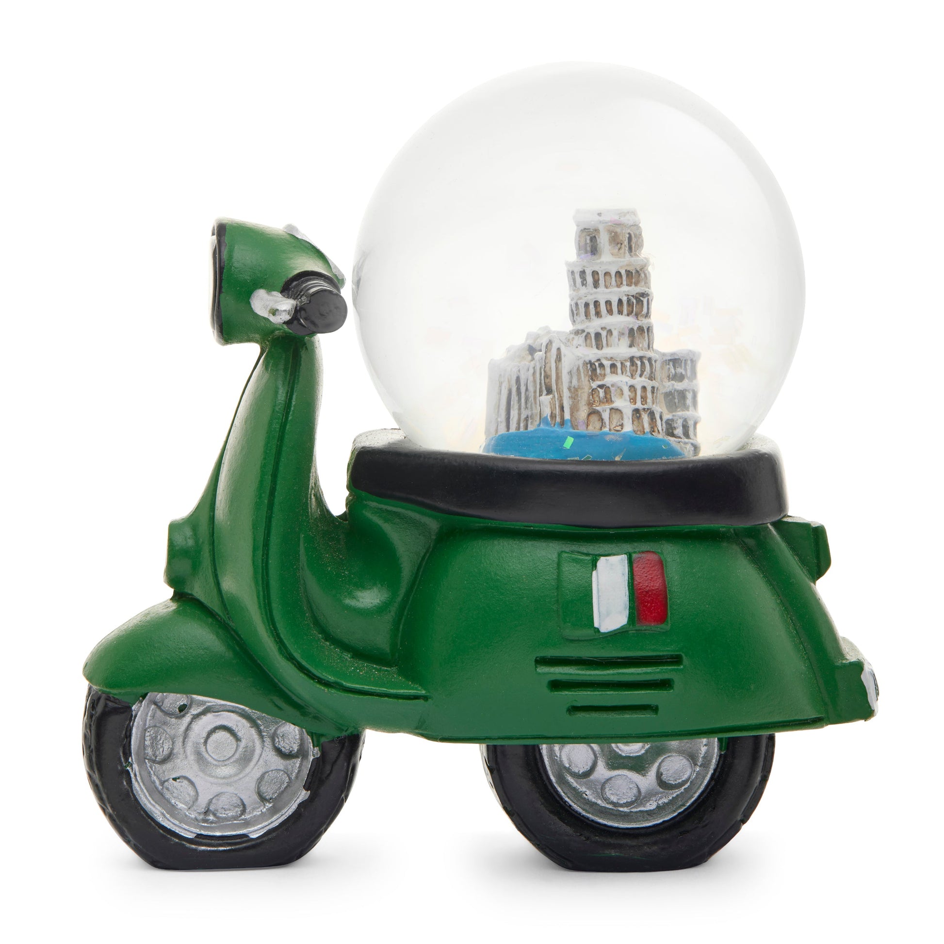 This snow globe features a resin base shaped like a green Vespa, beautifully accented with the Italian flag. A delightful keepsake that celebrates the elegance and vibrancy of Italian culture.