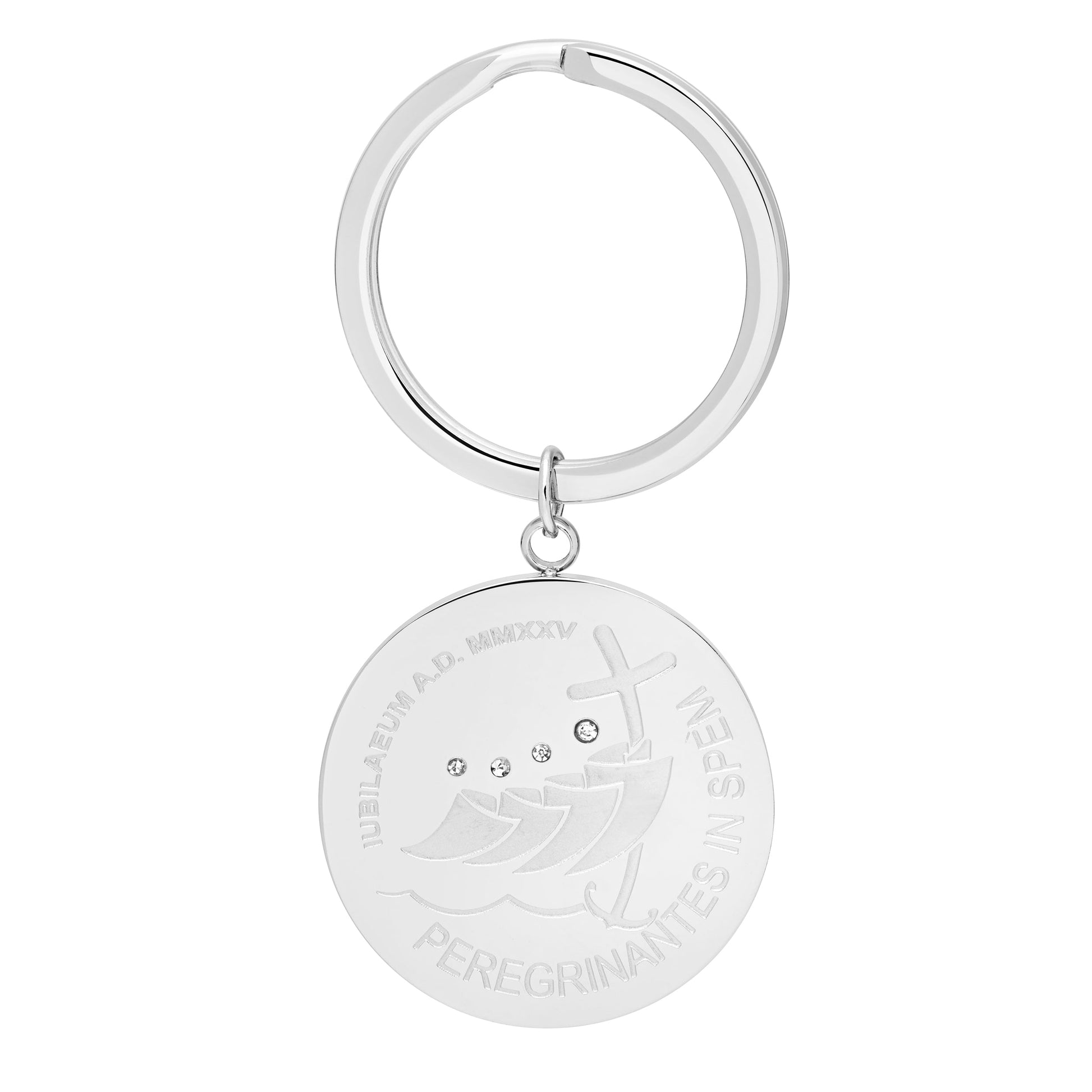 This elegant keychain is crafted from premium-quality stainless steel, ensuring exceptional durability and a refined finish. The medal features the Jubilee 2025 logo, silk-screened for precision and clarity, and is beautifully accented with sparkling zirconia, adding a touch of sophistication to this meaningful keepsake.