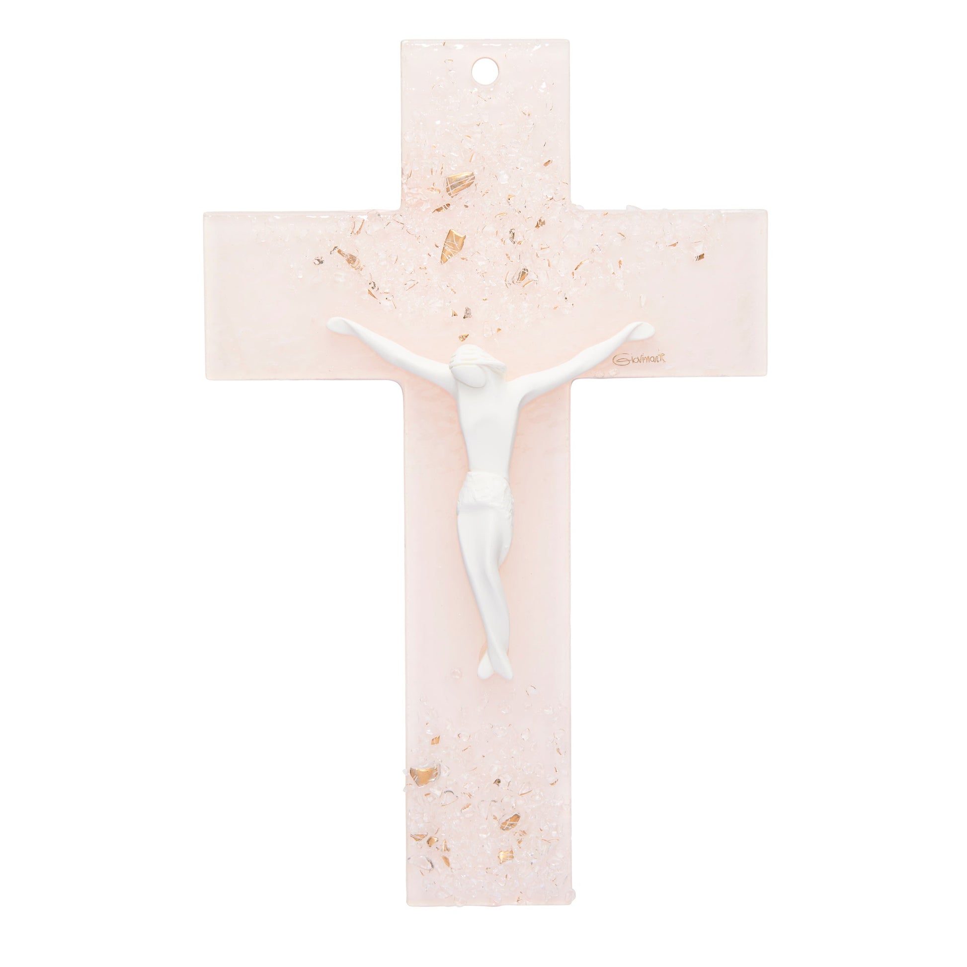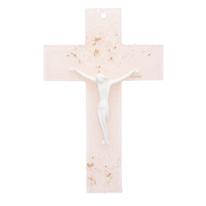 This refined glass crucifix features soft light pink tones and elegant three-dimensional details. The white resin corpus, in a modern style, adds a gentle contrast. The overall effect is delicate and harmonious, making it perfect for wall decoration that inspires peace and devotion.