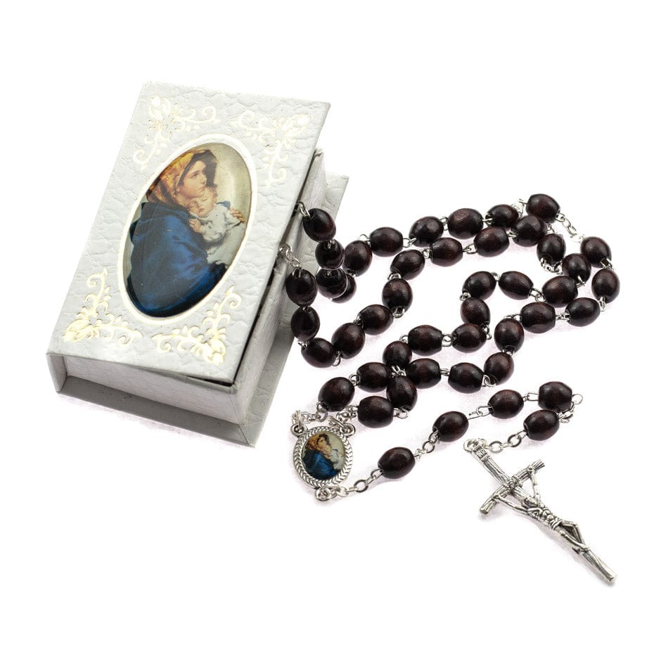 Wooden rosary holder with Ferruzzi Virgin shaped likea a book, rosary made up of 7mm oval wooden beads, centerpiece with the Virgin, Pastorale cross.