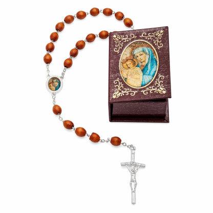 Dark brown Rosary holder book shaped in thick paper depicting the Virgin of Mater Ecclesiae. This nice case comes with a brown Rosary in wooden oval shape beads. Nice center medal featuring the same Virgin of the center medal, the Mater Ecclesiae. A simple Pastoral crucifix closes the Rosary.