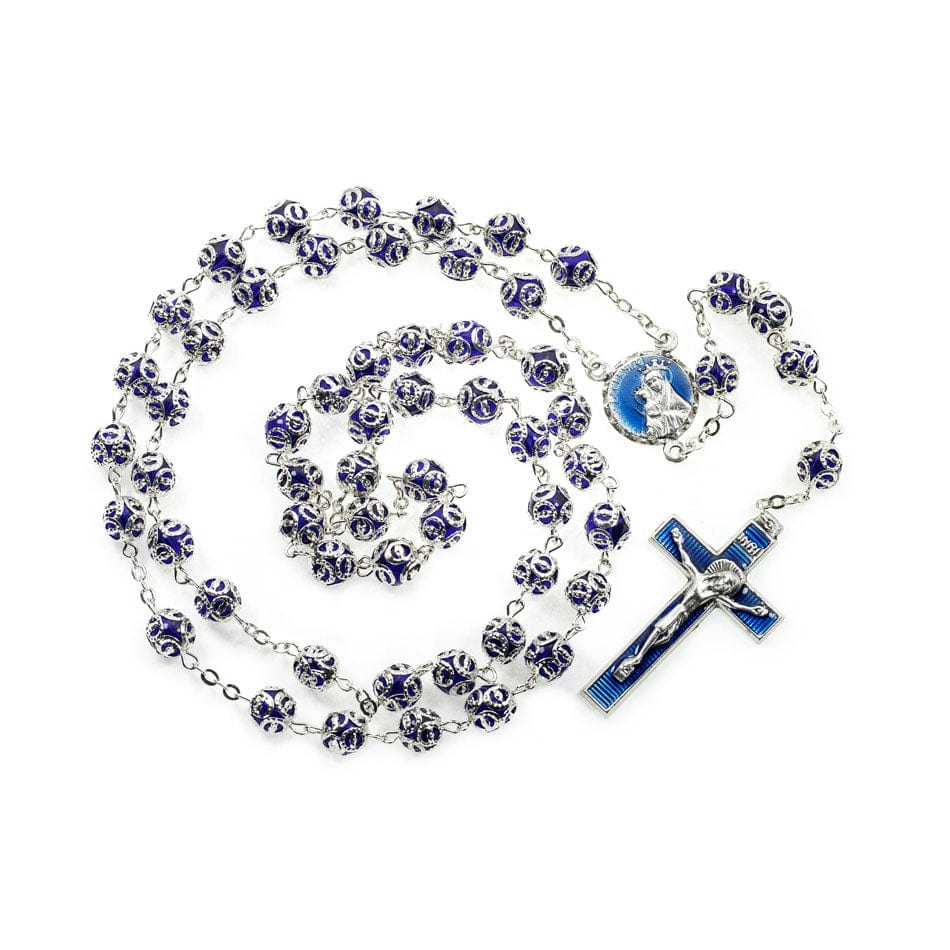 Rosary with filigree capped beads, blue enamel centerpiece and cross.