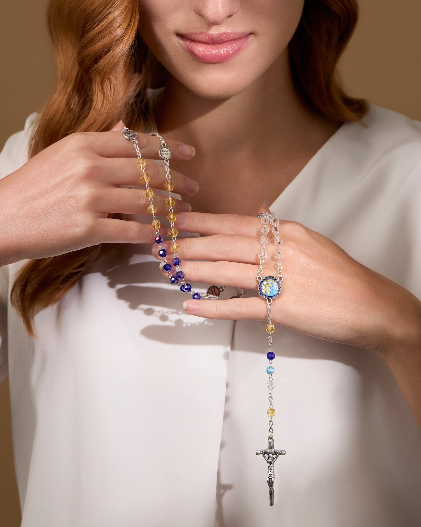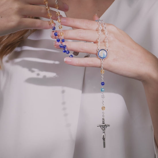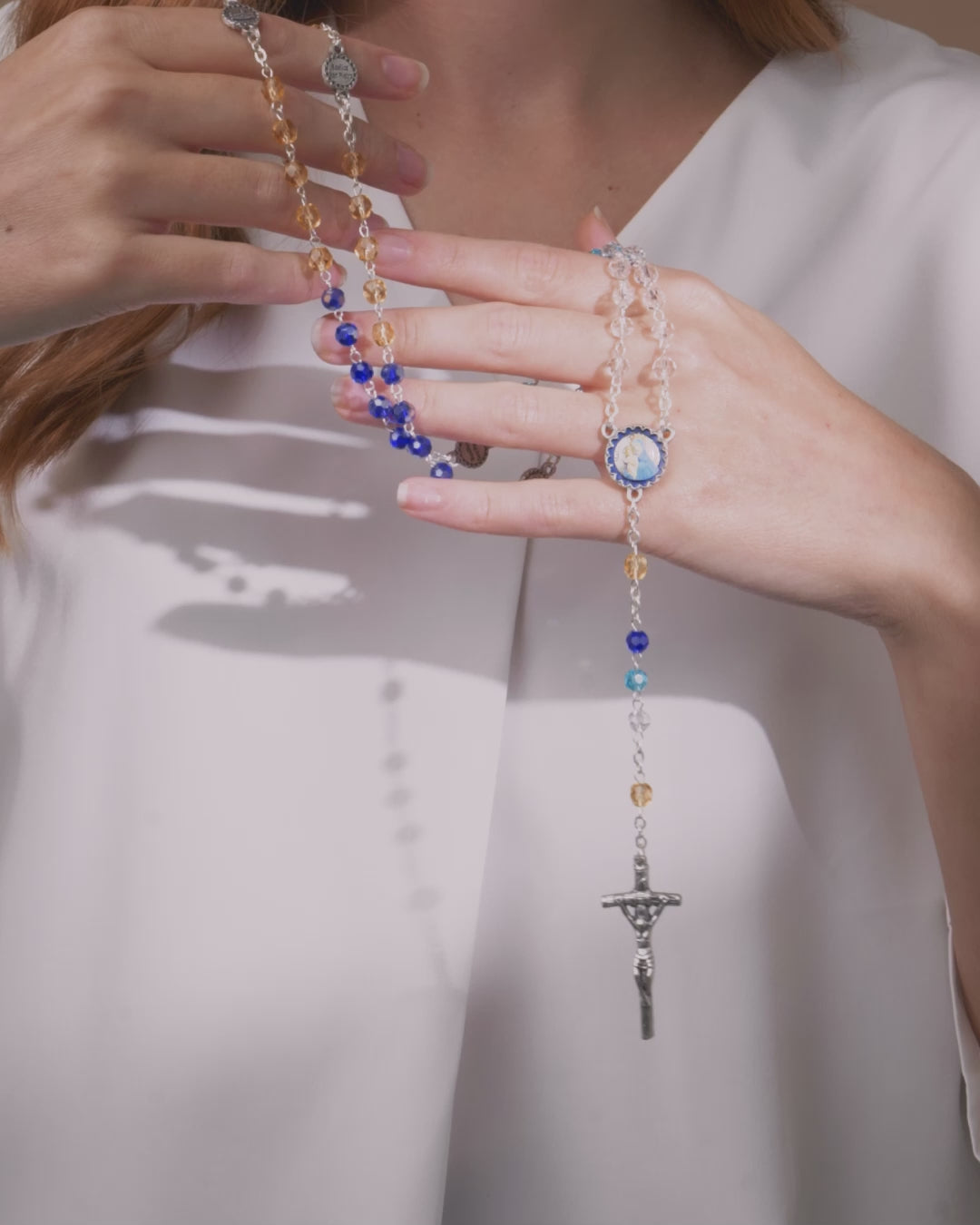 Mater Ecclesiae shades of blue crystal rosary, each decade has been realized using a different colour which represents a different meaning, the white and blue colour represent the Virgin Mary, the gold colour represents God, Praying the Rosary, through the Virgin Mary, we can reach God, centerpiece with Mater Ecclesiae Virgin, Pastorale Cross, box with the picture of the Virgin and little explanation of the item.