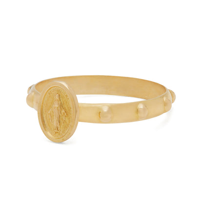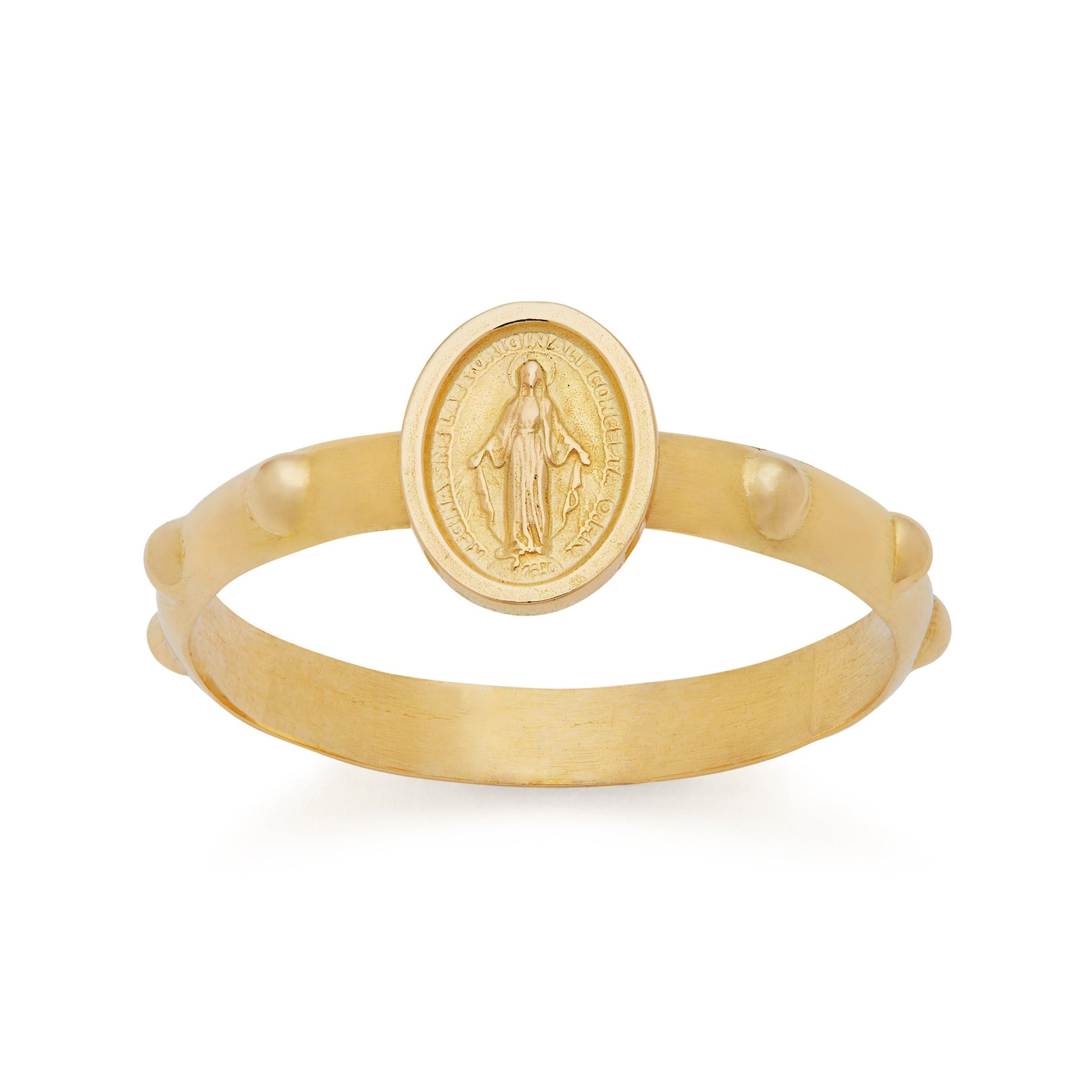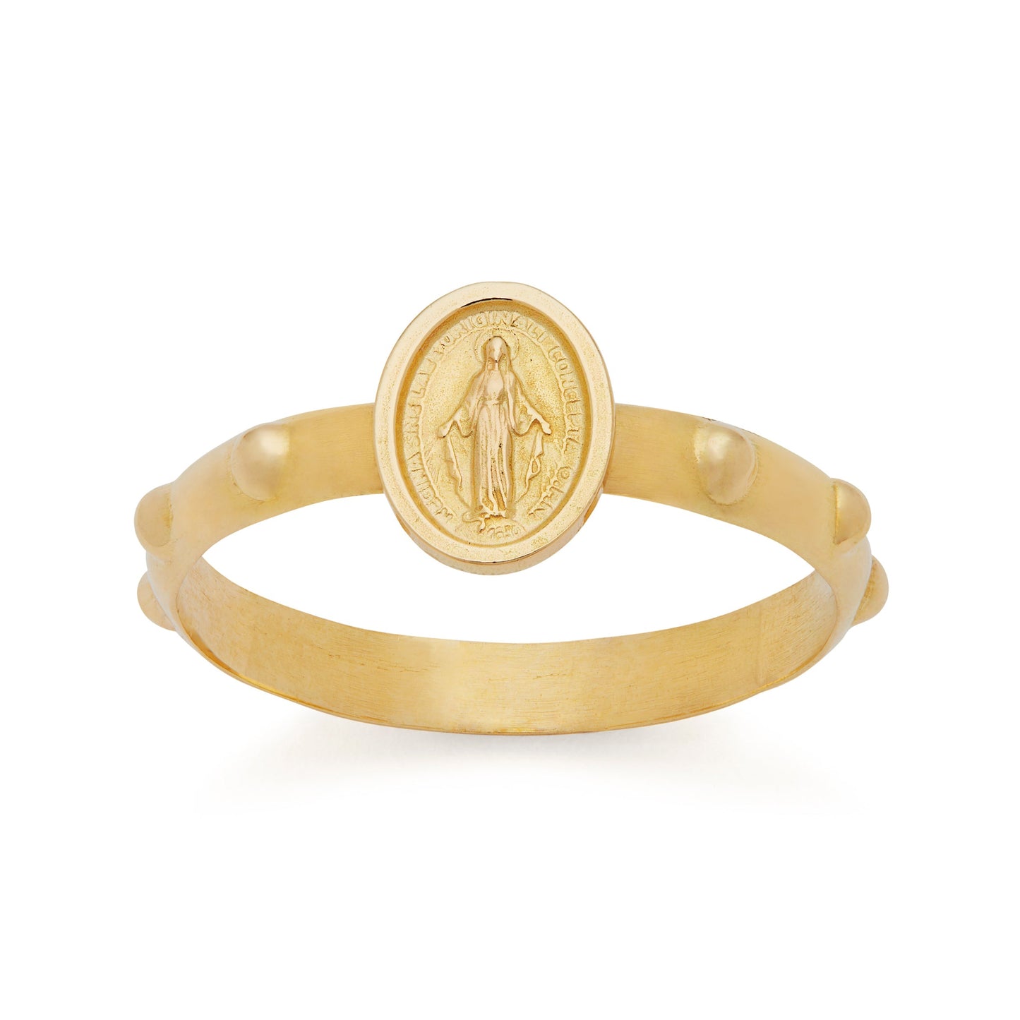 Rosary ring in 18kt yellow gold with a beautiful Miraculous Medal medal. It is delicately detailed and feminine.