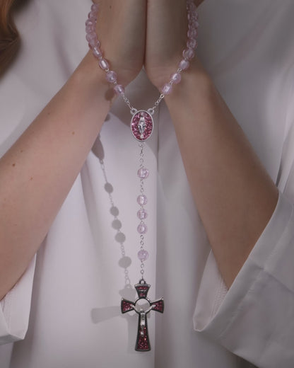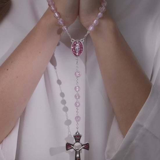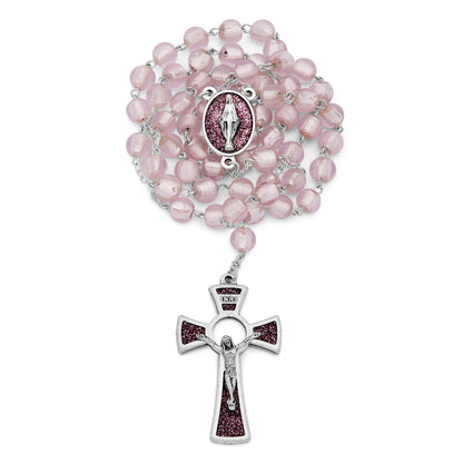 Rosary made from 6mm Murano beads, the colour is pink, centerpiece with the Miraculous Virgin, glitter centerpiece and cross.