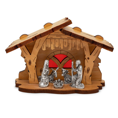 This intricately crafted Nativity Scene features a classic wooden hut and a red background, creating a beautiful representation of the first Christmas. Handmade with detailed woodwork, this unique piece is sure to become a treasured family heirloom.