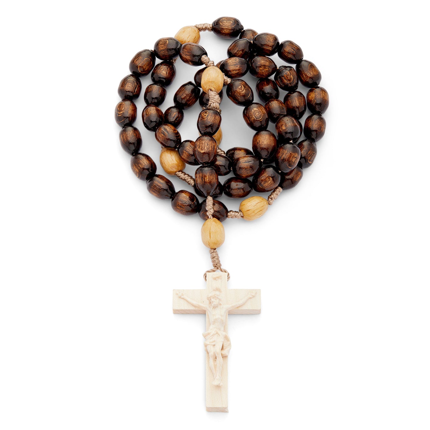 Holy rosary for your daily Catholic prayers composed by oval natural wood beads and rope binding. In Christianity, wood symbolizes poverty, which is one of the three Evangelical counsels, dear to Saint Francis of Assisi, together with Chastity and Obedience. Beautiful handcrafted Cross in Natural Wood.
