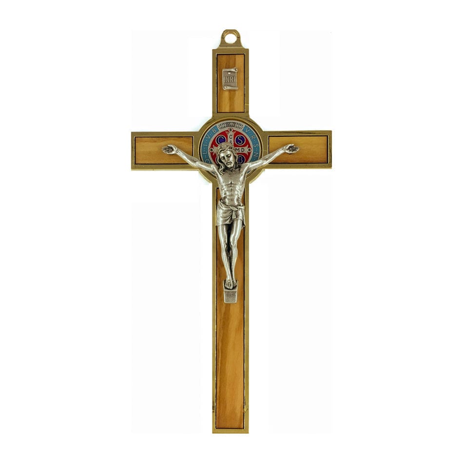 Olive wood cross of Saint Benedict for the wall. Made from the highest quality of olive wood, our Saint Benedict crucifix is an iconic symbol of faith and devotion. This beautiful cross will add a touch of sacred elegance to any space and serve as a tangible reminder of God's love and protection. Crafted with colorful medal and gold metal outlining, this crucifix is sure to be a cherished piece in your home.