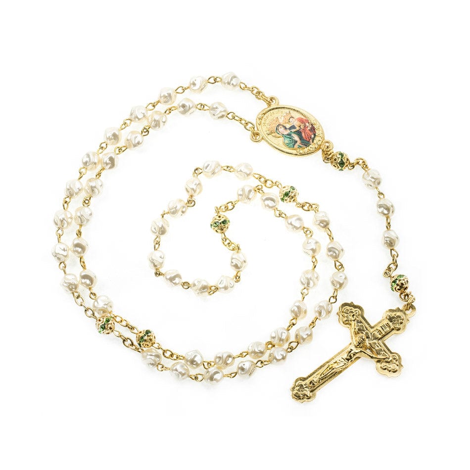 This refined rosary is made of glass pearl beads, with Our Father beads adorned with sparkling crystals.