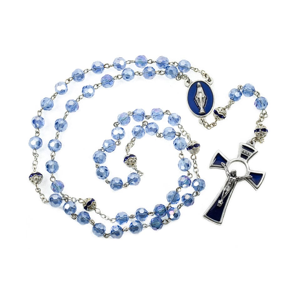 This beautiful Rosary has faceted crystal beads, enameled centerpiece of Our Lady of Grace, our fathers have blu crystal rhinestones encapsulated with ornated pewter caps, the cross is enameled.