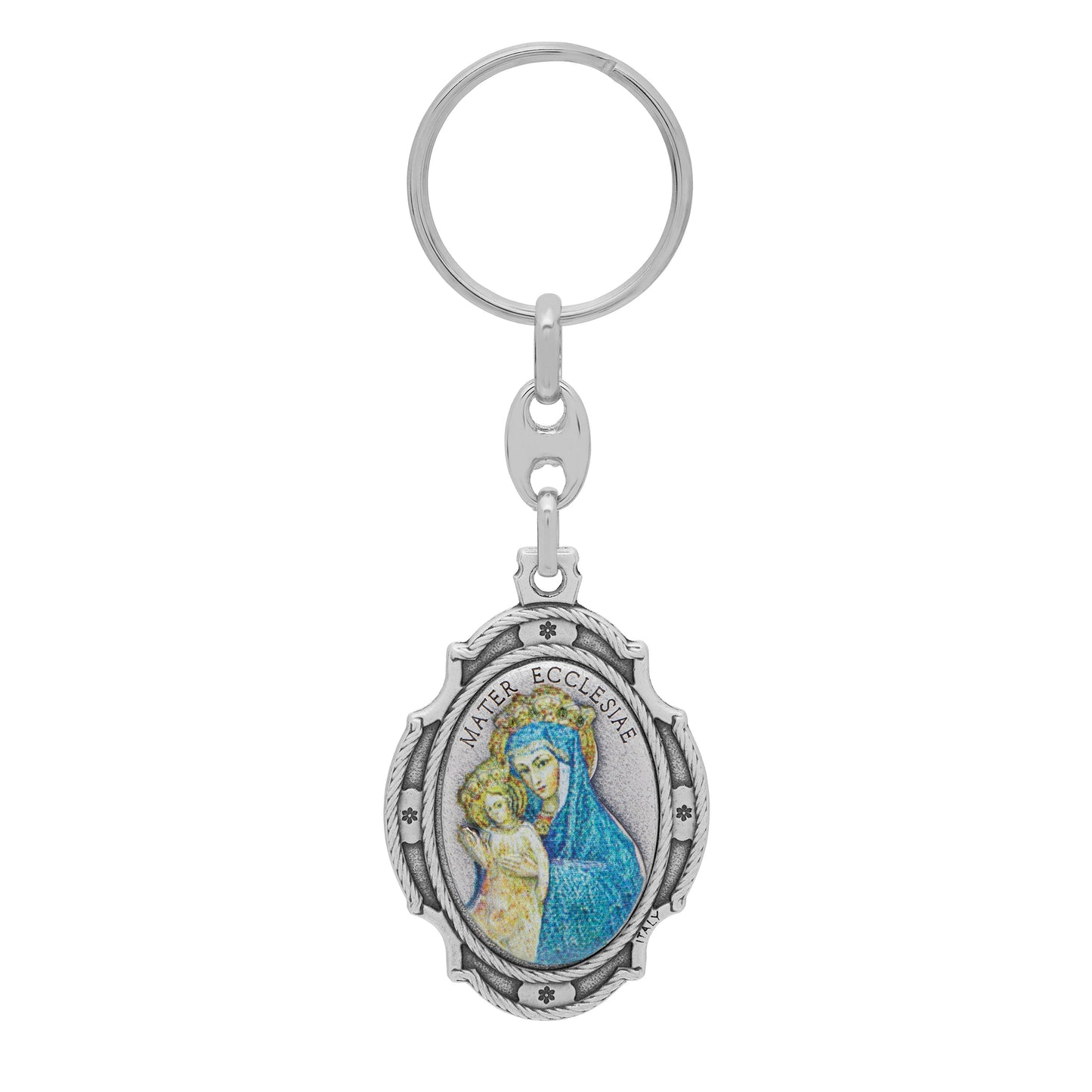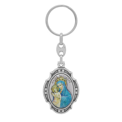 Oval Colored Metal Keychain of Mater Ecclesiae With Worked Frame