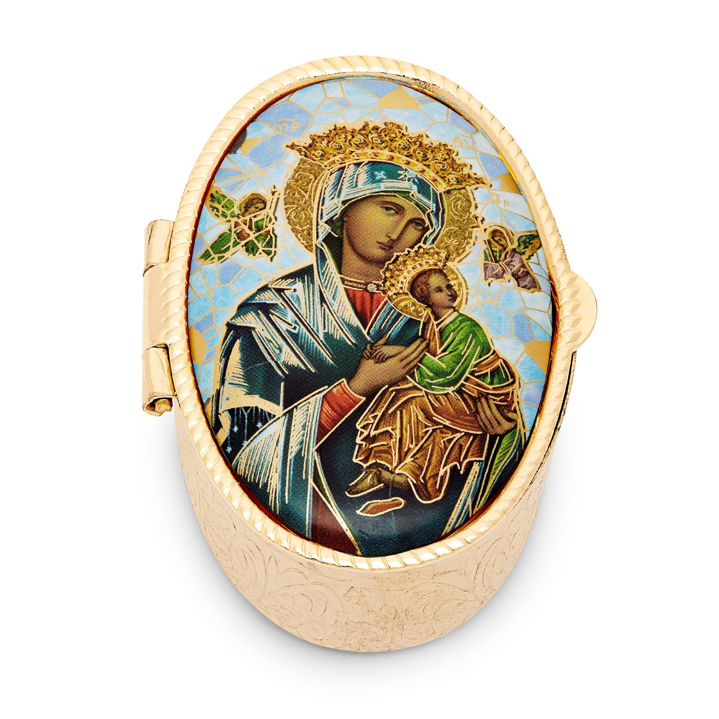 Oval Pill Box in Gold-tone Metal of Our Lady of Perpetual Help