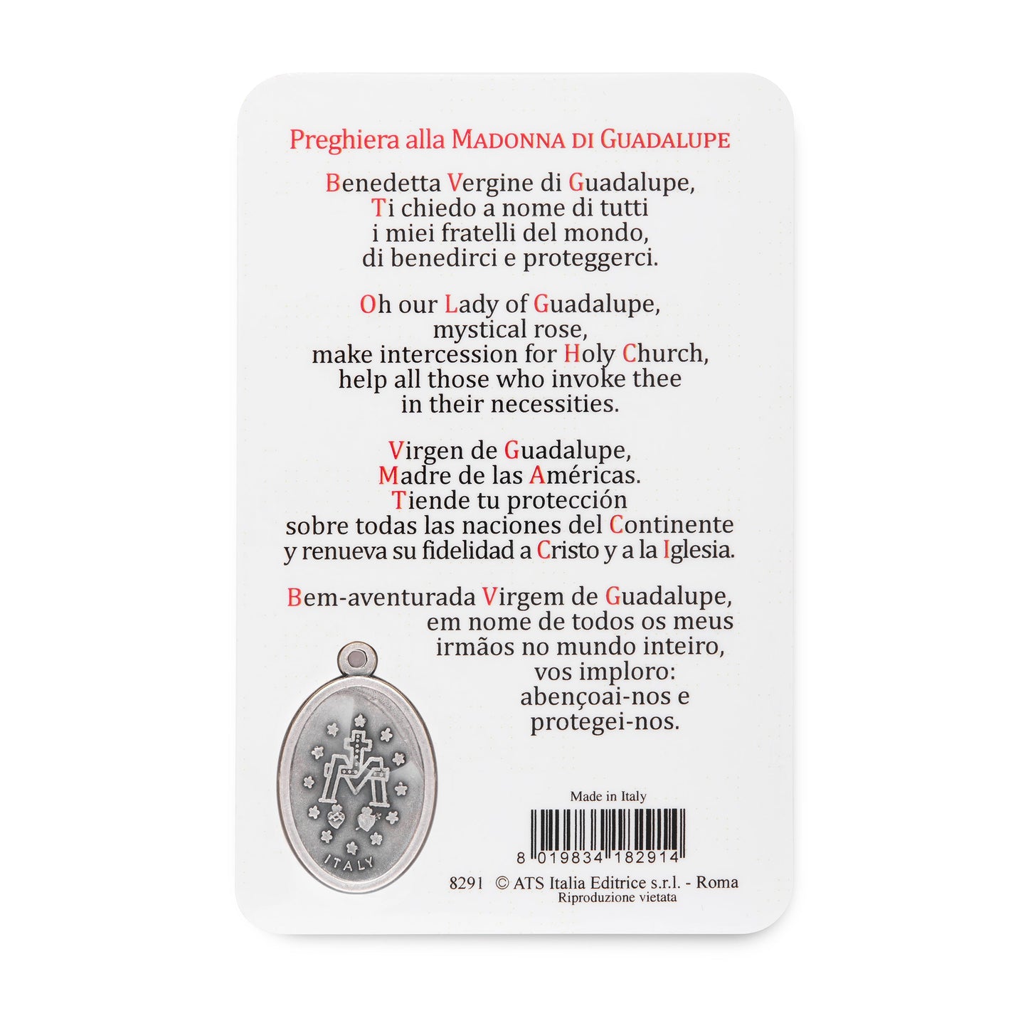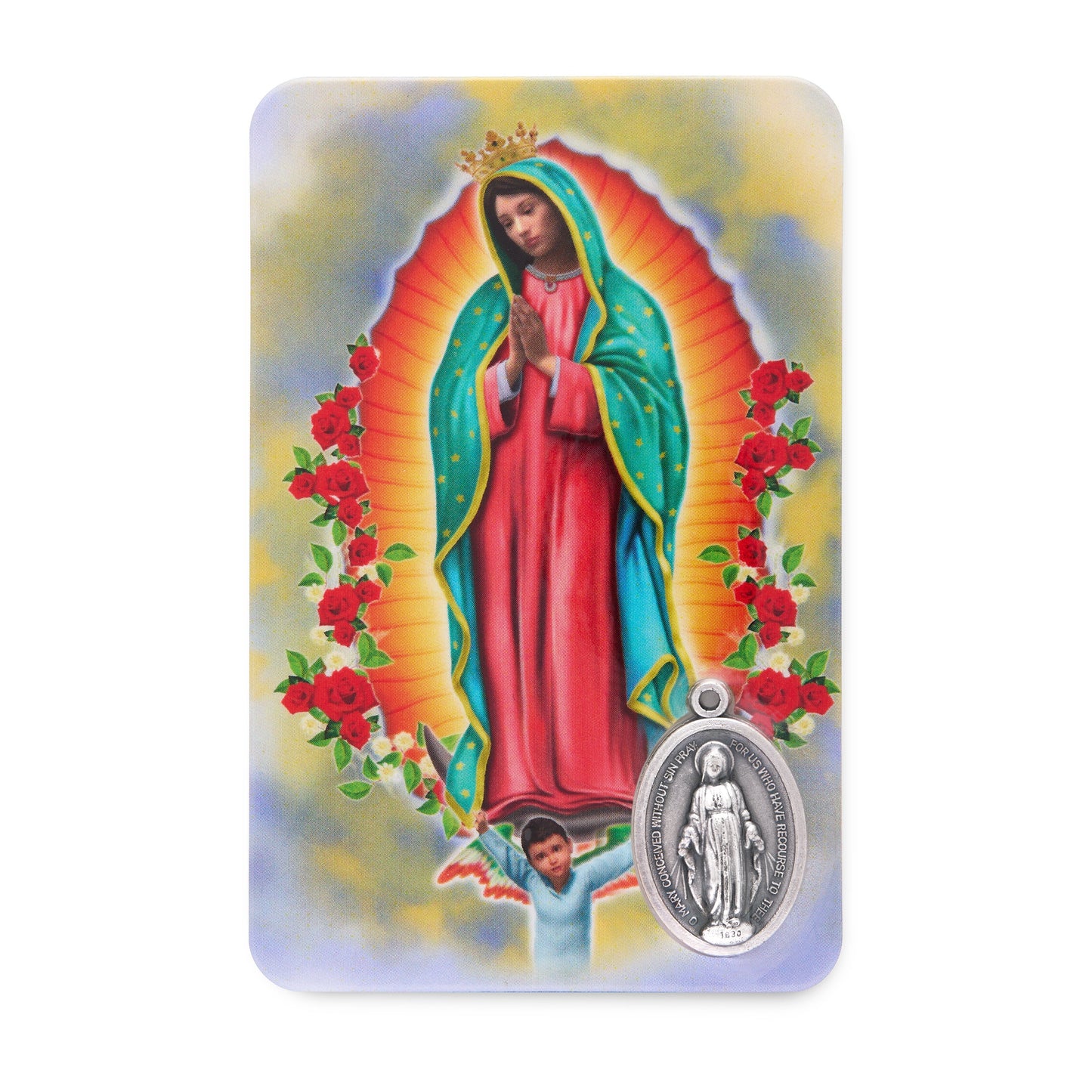 This durable holy card features a beautifully detailed image of Our Lady of Guadalupe, protected by a long-lasting plasticized coating. Venerated as the Patroness of the Americas and a symbol of hope and unity, Our Lady of Guadalupe holds a special place in the hearts of the faithful. The card includes a finely crafted metal medal engraved with her image, making it a meaningful devotional item or gift.