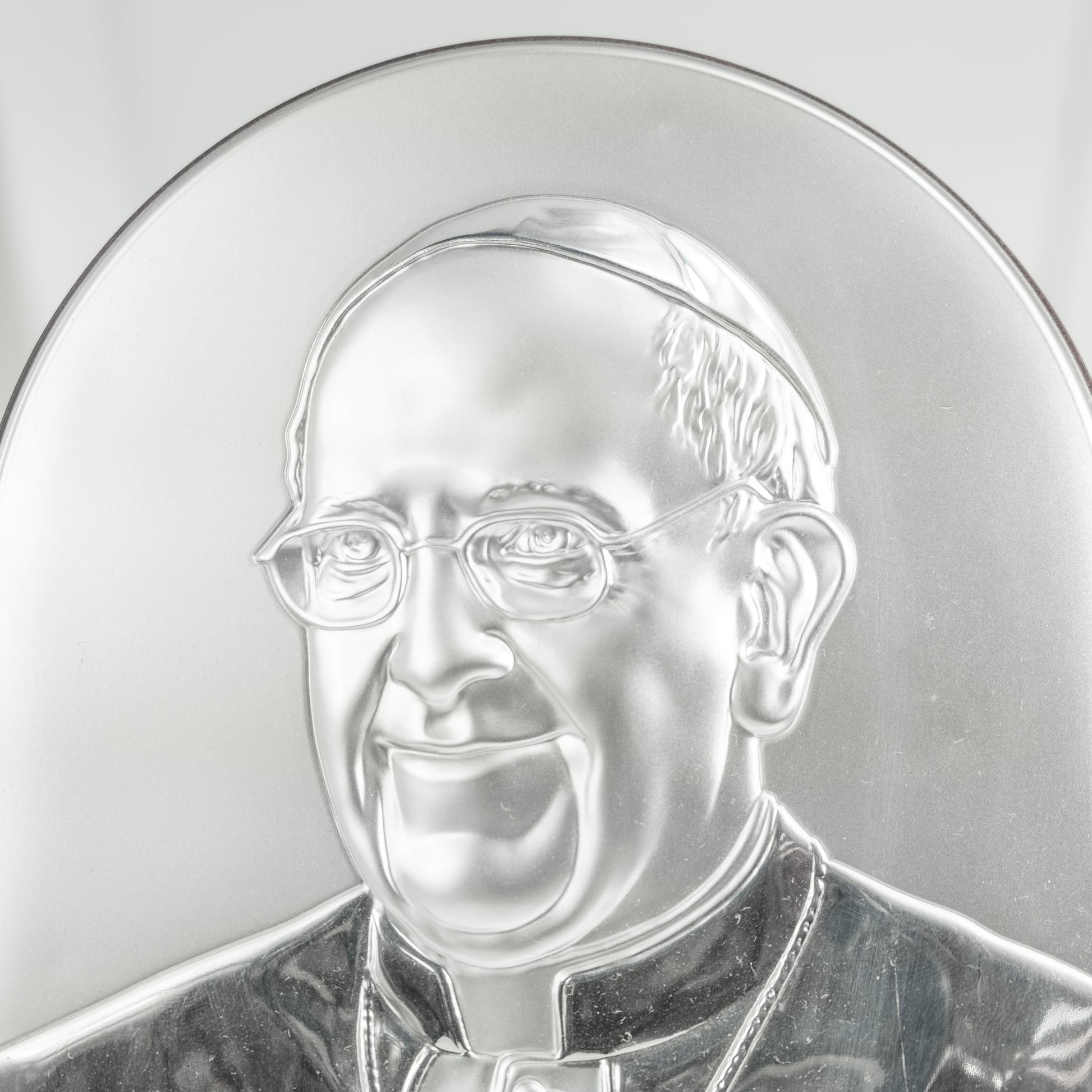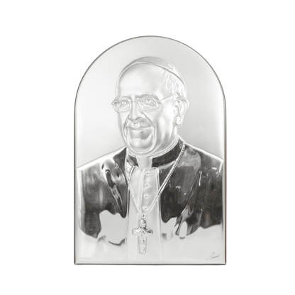 This elegant religious picture features a detailed portrait of Pope Francis, crafted in bilaminate silver with a polished finish and delicate relief work. The Pope is depicted in a moment of blessing, radiating the humility, peace, and compassion that marked his pontificate.