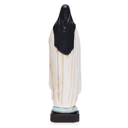 This beautifully detailed resin statue honors St. Thérèse of Lisieux, also known as "The Little Flower of Jesus." St. Thérèse is celebrated for her simple yet profound spirituality, teaching the "little way" of love and trust in God. This statue is a perfect devotional piece for those seeking inspiration from her humility and deep faith, ideal for any home or prayer space.