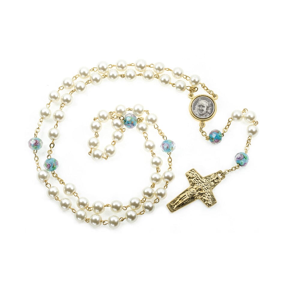 Pope Francis Rosary with Light Blue Glass and Synthetic Pearl Beads