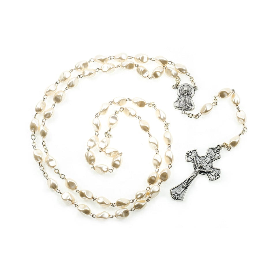 Rosary made up of 8mm cream fresh water pearl beads, connector with the Sacred Heart of Jesus.