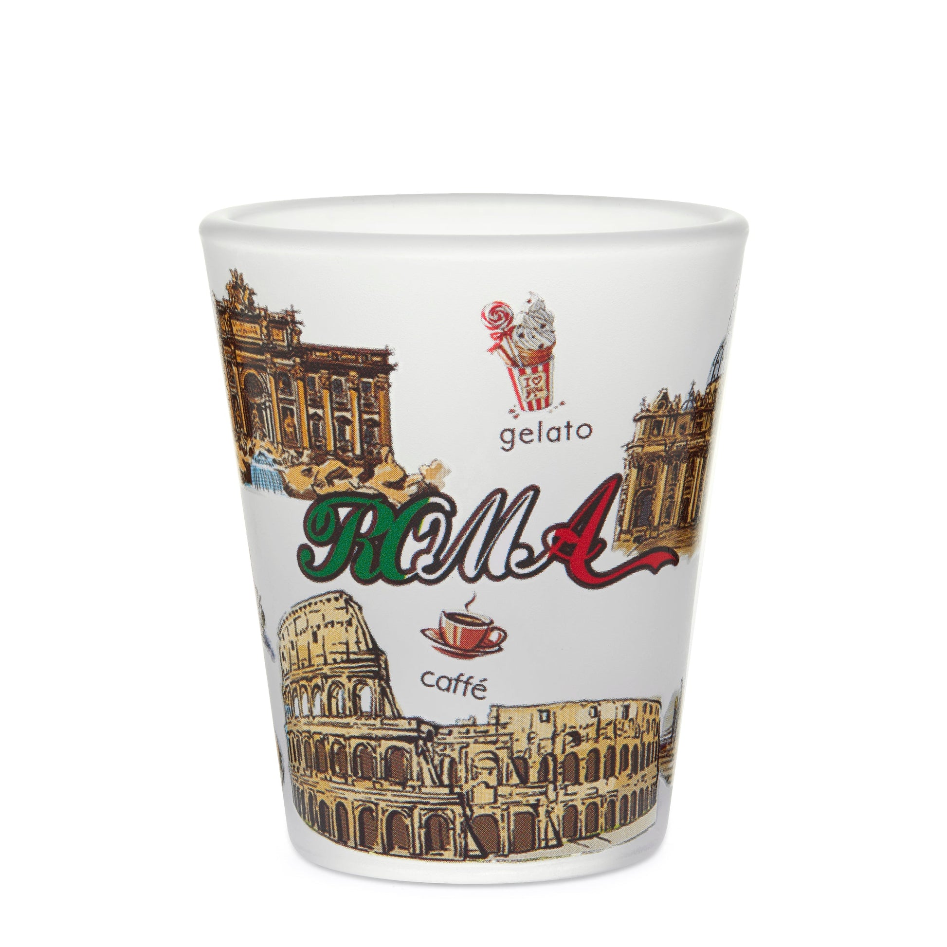 A satin souvenir shot glass featuring illustrations of Rome's iconic monuments and traditional foods, such as gelato. A perfect keepsake to celebrate the beauty and culture of Rome.
