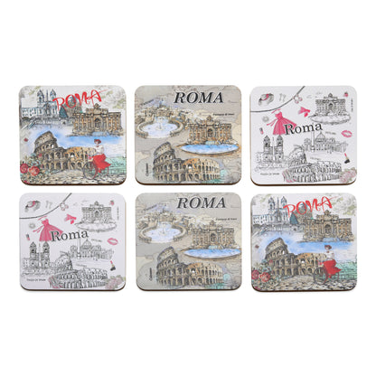 A charming set of 6 cork coasters showcasing the most iconic landmarks of Rome, such as the Colosseum, St. Peter's Basilica, the Trevi Fountain, and more. A perfect addition to your home décor or a delightful gift for Rome enthusiasts.