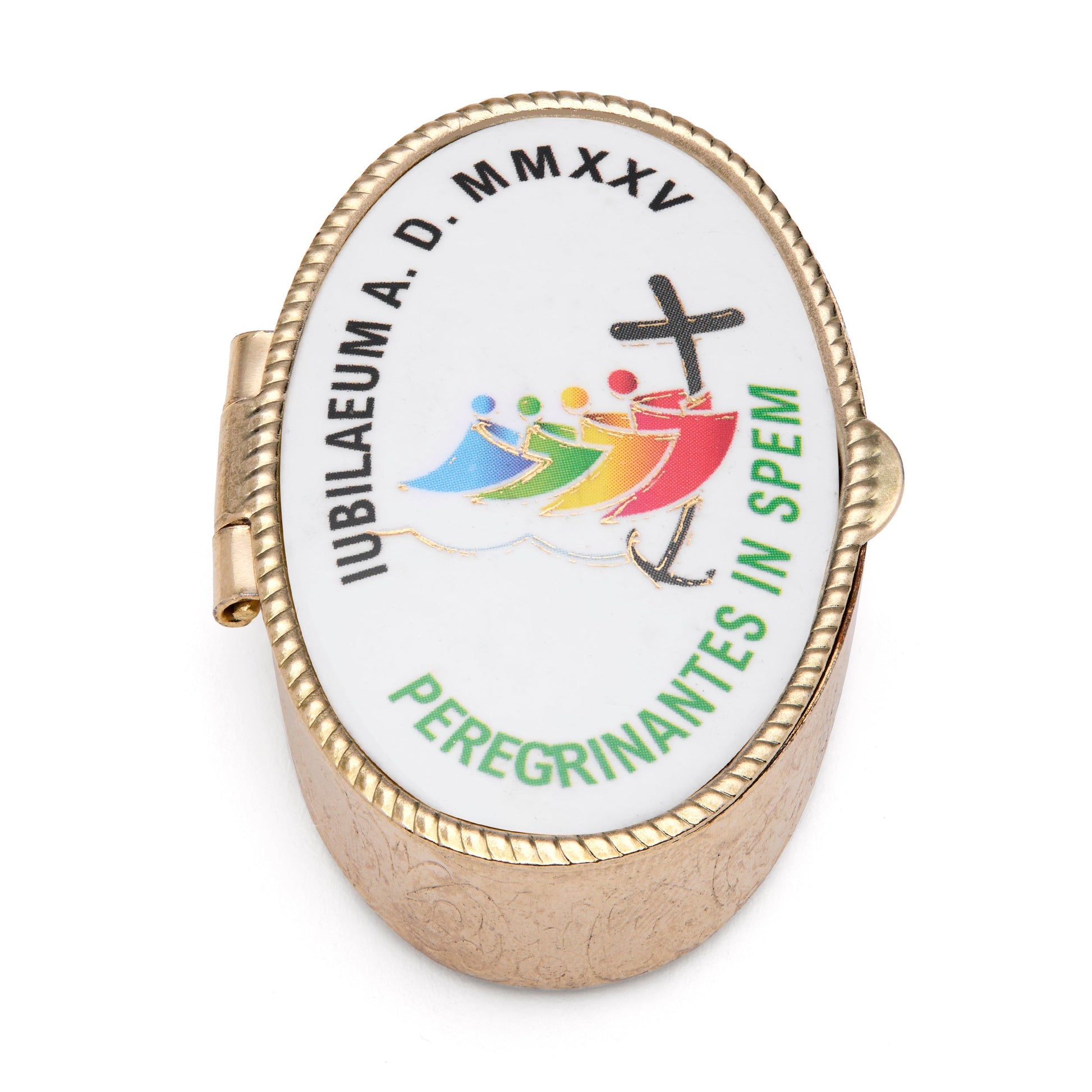 This small oval pill box in gold-tone metal features a white background adorned with the official Jubilee 2025 logo. Its elegant and compact design makes it a stylish accessory that's both practical and commemorative—perfect as a keepsake or gift to honor this significant event.