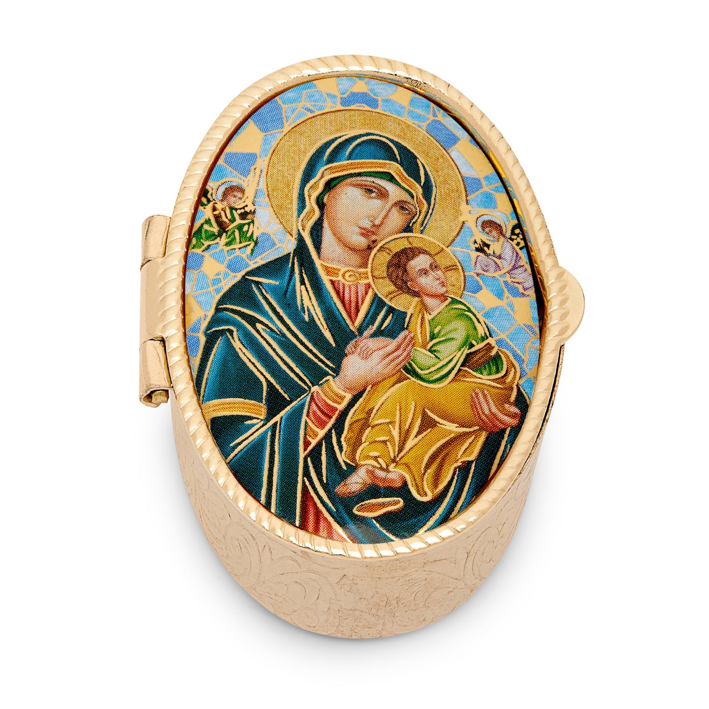 Small Oval Pill Box in Gold-tone Metal of Our Lady of Perpetual Help