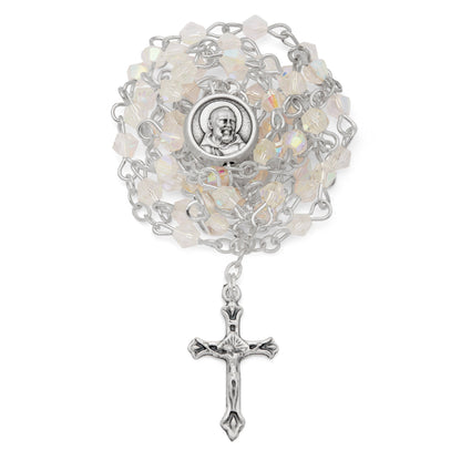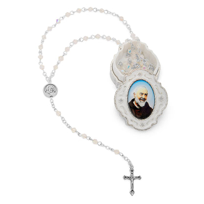 Small White Enameled Padre Pio Rosary Case With White Crystal Rosary