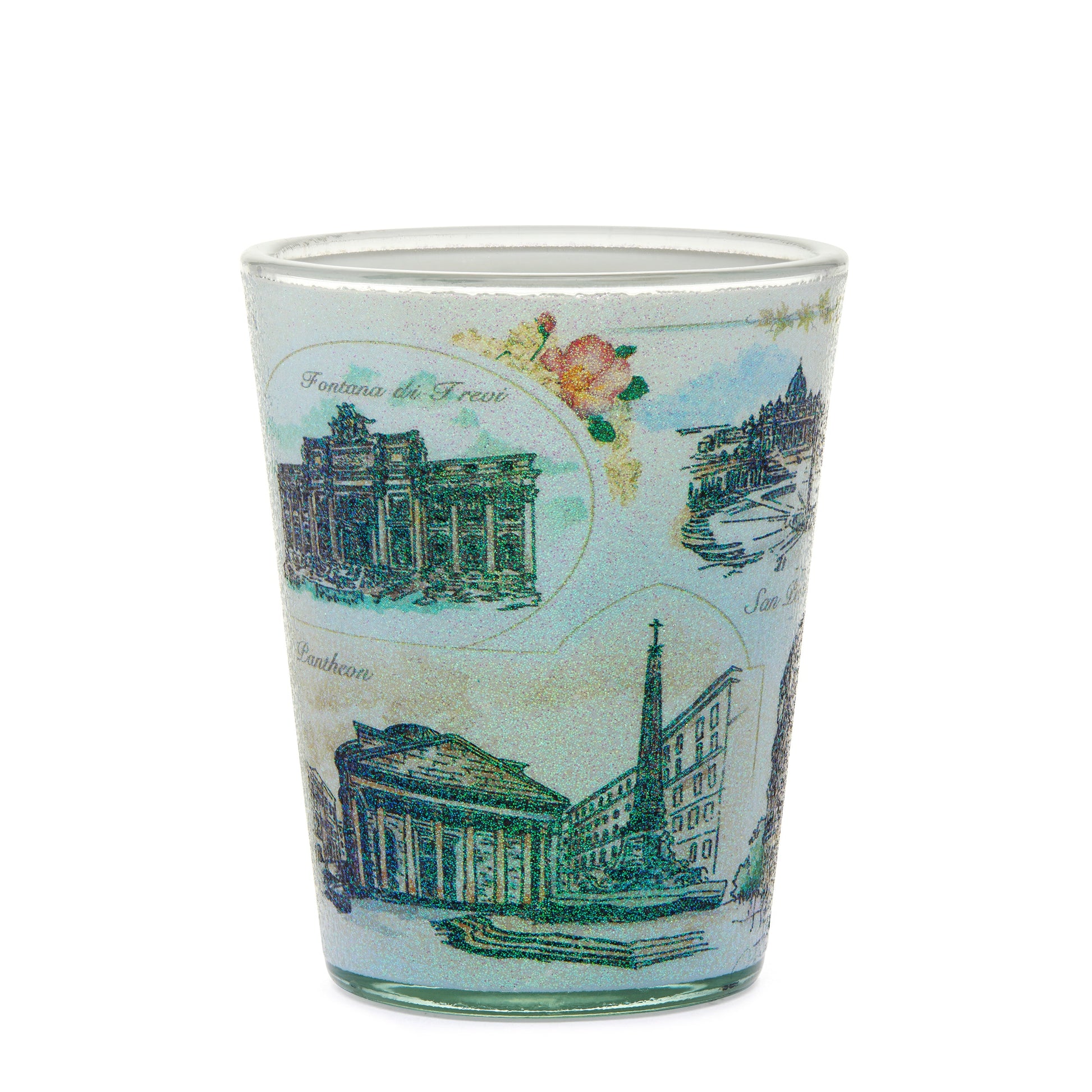 A charming souvenir shot glass made of glass, perfect for collectors or as a gift. Its subtle sparkly finish highlights the iconic monuments of Rome, making it a beautiful keepsake to remember the Eternal City.