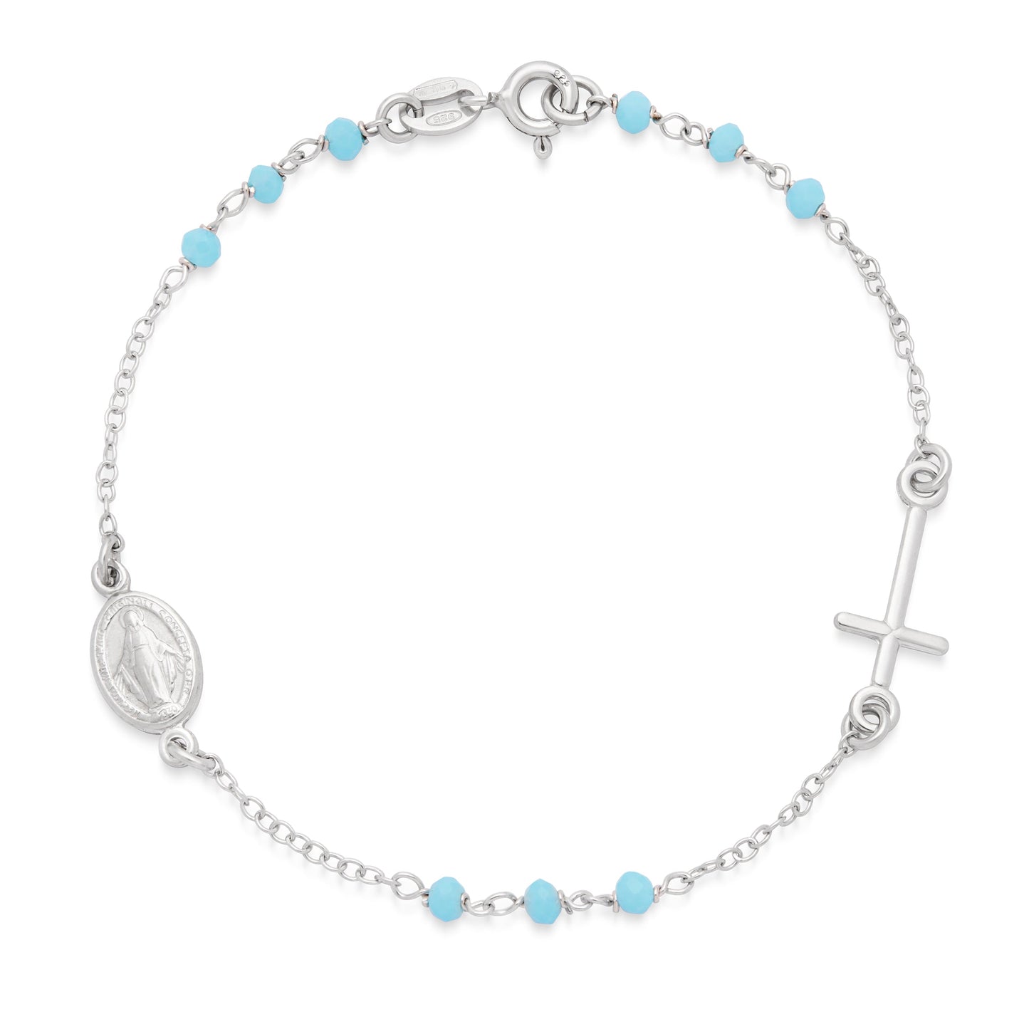 Sterling Silver Bracelet with Light Blue Beads Featuring the Miraculous Medal and a Cross